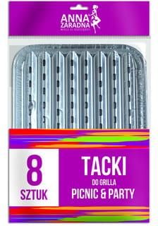 Tacki piknikowe do grilla firmy Anna Zaradna Najwyższej jakości aluminiowe tacki grillowe to niezbędny element wyposażenia każdego entuzjasty grillowania. Zaprojektowane z dbałością o każdy szczegół. Dzięki precyzyjnie wykonanej konstrukcji, tacki grillowe skutecznie oddzielają ogień i ruszt od potraw, eliminując bezpośredni kontakt i minimalizując ryzyko zanieczyszczeń. Dodatkowo, dzięki specjalnie zaprojektowanym otworom na wyższej fali, potrawy są poddawane obróbce termicznej a tłuszcz zbiera się w bezpieczny sposób na dnie tacki, ułatwiając późniejsze czyszczenie rusztu. Specyfikacja: Firma: Anna Zaradna Opakowanie: folia Wymiary: 26 x 40,5 x 4 cm Ilość sztuk: 8 Materiał: aluminium UWAGA ! W przypadku zainteresowania i braku produktu na stronie, skontaktuj się z nami przez formularz „zapytaj o produkt”.