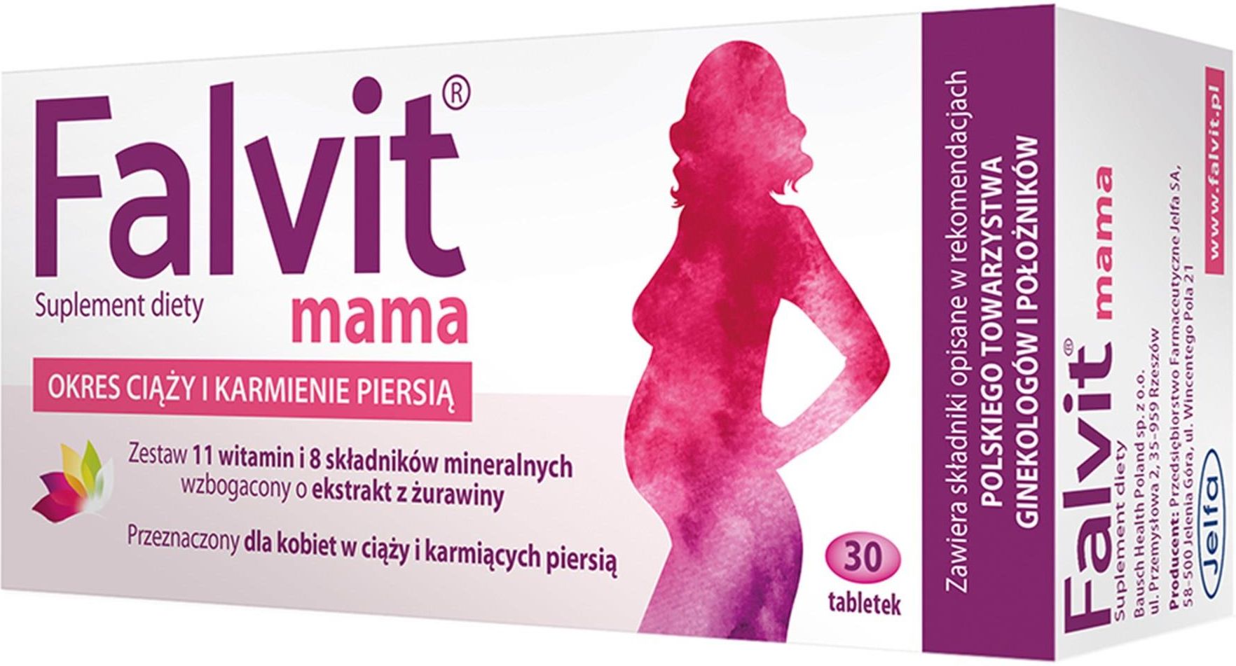.falvittext { font-size: 2em; } .cechytext{ margin: 0px 36px; } .texttex2 { margin-left: -13%; } .cn1_1 .lnd_media.lnd_ie-bug-flex.lnd_col-2 { margin-left: -9%; margin-top: -3%; } .cn1_2 .lnd_media.lnd_ie-bug-flex.lnd_col-2 { margin-left: -9%; margin-top: -6%; } .text2 { background: #dd3c72; color: white; font-size: 2em; border-radius: 25px; padding: 10px 120px; } .tabsklad { border: 3px solid #dd3c72; border-radius: 15px; padding: 10px; } .tabsklad2 { border: 3px solid #83276b; border-radius: 15px; padding: 10px; } .cn3 ul li{ color:#db097a; } .text3 { font-size: 3em; color: white; } .button_falvit { background: white; font-size: 2em; max-width: 250px; border-radius: 25px; margin: 0 auto; color: #83276b; } .textbox2 { margin: 0 20px; } @media only screen and (max-width: 720px) { .falvittext { font-size: 2em; } .cn1 .lnd_grid-items>* { min-width: 100%; } .cn2_tabele .lnd_grid-items>* { min-width: 100%; } .cn1_ikonki .lnd_grid-items>* { min-width: 100%; } .cn1_ikonki .js_content_paragraph.lnd_card.lnd_col-4 { display: flex; flex-direction: row-reverse; } .cn1_ikonki .lnd_media.lnd_ie-bug-flex.lnd_col-3 { width: 70% !important; } .naglowek-opis{ width:150%; } .texttex2 { margin-left: 0%; } .cn1_1 .lnd_media.lnd_ie-bug-flex.lnd_col-2 { margin-left: 0%; margin-top: 0%; } .cn1_2 .lnd_media.lnd_ie-bug-flex.lnd_col-2 { margin-left: 0%; margin-top: 0%; } .cn1_2 .js_content_paragraph.lnd_card.lnd_col-12 { display: flex; flex-direction: row-reverse; } .cn1_2 .lnd_media.lnd_ie-bug-flex.lnd_col-2 { width: 30% !important; } .cn1_1 .js_content_paragraph.lnd_card.lnd_col-12 { display: flex; flex-direction: row-reverse; } .cn1_1 .lnd_media.lnd_ie-bug-flex.lnd_col-2 { width: 30% !important; } .cechytext{ margin: 0px; } .cn1_3 .lnd_grid-items>*{ min-width:100% } .text2 { padding: 10px 10px; } } Falvit ® mama to suplement diety przeznaczony dla kobiet w ciąży i karmiących piersią, do stosowania w okresie ciąży i laktacji. Jest to zestaw 11 witamin i 8 składników mineralnych wzbogacony o ekstrakt z żurawiny, który uzupełnia zwiększone zapotrzebowanie organizmu kobiety na składniki odżywcze w tym szczególnym okresie. Optymalna kompozycja składników dla kobiet w ciąży i karmiących Falvit ® mama to zestaw 11 witamin i 8 składników mineralnych wzbogaconych o ekstrakt z żurawiny dla uzupełnienia organizmu przyszłej mamy w ważne w tym czasie witaminy i składniki mineralne. 1 tabletka dziennie Wygoda stosowania. Wystarczy tylko 1 tabletka dla uzupełnienia diety przyszłej mamy o ważne witaminy i składniki mineralne. Wysoka jakość produktu Falvit ® mama to polski produkt o długiej tradycji na rynku. Za jego jakością stoi renomowany producent leków – PF Jelfa w Jeleniej Górze. Bogaty skład w trosce o zdrową ciążę* 1 tabletka Falvit ® mama zawiera 11 witamin i 8 składników mineralnych, w tym składniki opisane w rekomendacjach Polskiego Towarzystwa Ginekologów i Położników, m.in.: FOLIANY przyczyniają się do wzrostu tkanek matczynych w czasie ciąży. JOD  pomaga w prawidłowym funkcjonowaniu układu nerwowego. Dodatkowo wspiera produkcję hormonów tarczycy i jej działanie. Jod wpływa na utrzymanie odpowiednich funkcji poznawczych. ŻELAZO  pomaga w prawidłowej produkcji czerwonych krwinek i hemoglobiny. Jest potrzebne do transportu tlenu w organizmie. Wspiera także pracę układu odpornościowego, przyczynia się do zmniejszenia uczucia zmęczenia i znużenia oraz bierze udział w procesie podziału komórek. WITAMINA D  pomaga w utrzymaniu zdrowych kości i zębów oraz w odpowiednim wchłanianiu i wykorzystaniu wapnia i fosforu. Dodatkowo produkt zawiera: Standaryzowany EKSTRAKT Z ŻURAWINY; CYNK pomagający w prawidłowej syntezie DNA; RYBOFLAWINĘ pomagającą w utrzymaniu prawidłowego stanu błon śluzowych; MIEDŹ pomagającą w utrzymaniu prawidłowego stanu tkanek łącznych; WAPŃ, który przyczynia się do prawidłowego krzepnięcia krwi; SELEN pomagający zachować zdrowe włosy i paznokcie; NIACYNĘ pomagającą zachować zdrową skórę. Falvit ® mama przeznaczony jest do stosowania: W trosce o zdrowie kobiet*** polecamy również: Falvit ® Dla kobiet na każdym etapie życia Falvit ®  estro+ Dla kobiet w okresie menopauzy** SPRAWDŹ SPRAWDŹ   * Foliany przyczyniają się do wzrostu tkanek matczynych w czasie ciąży. **Chmiel zwyczajny pomaga zachować spokój i komfort w okresie menopauzy. ***Witamina C pomaga w prawidłowym funkcjonowaniu układu odpornościowego. Skład: Sposób stosowania: Zalecana porcja do spożycia w ciągu dnia niezbędna do uzyskania korzystnego działania:    1 tabletka dziennie podczas posiłku lub bezpośrednio po nim. Nie należy przekraczać zalecanej porcji do spożycia w ciągu dnia. Prowadzenie zdrowego trybu życia i stosowanie zrównoważonej diety są niezbędne dla zachowania dobrego stanu zdrowia. Suplementy diety nie mogą być stosowane jako substytut (zamiennik) zróżnicowanej diety. Opakowanie: Falvit ® mama dostępny jest  w opakowaniach 30 i 60 tabletek. Przechowywanie: Przechowywać w suchym miejscu w temperaturze nie wyższej niż 25°C, w szczelnie zamkniętym opakowaniu, w sposób niedostępny dla małych dzieci. Chronić przed światłem. Inne informacje: Podmiot odpowiedzialny za informacje o produkcie:  Bausch Health Poland sp. z o.o., ul. Przemysłowa 2, 35-959 Rzeszów Miejsce wytwarzania: Przedsiębiorstwo Farmaceutyczne Jelfa SA, ul. Wincentego Pola 21, 58-500 Jelenia Góra Suplementy diety nie mogą być stosowane jako substytut (zamiennik) zróżnicowanej diety. Prowadzenie zdrowego trybu życia i stosowanie zrównoważonej diety są niezbędne dla zachowania dobrego stanu zdrowia. Podmiot odpowiedzialny za informacje o produkcie: Bausch Health Poland sp. z o.o., ul. Przemysłowa 2, 35-959 Rzeszów.