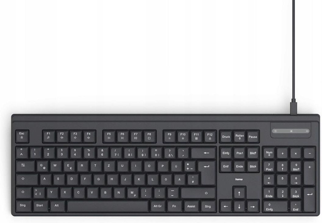 KLAWIATURA PRZEWODOWA Hama CK-100 Czarna Pełnowymiarowa klawiatura przewodowa z cichymi klawiszami Funkcjonalność Prosta w użyciu, od razu gotowa do użycia Podłączana przez kabel USB-A – USB-C W przypadku uszkodzenia przewodu można wymienić go na nowy bez konieczności wymiany klawiatury W zestawie adapter USB-C do USB-A Ciche klawisze Szybka obsługa multimediów z klawiszami F Pełnowymiarowa z blokiem numerycznym Składane nóżki umożliwiają ustawienie kąta nachylenia Przycisk asystenta AI – Microsoft Copilot (sztuczna inteligencja) Wykonana w 65% z materiałów pochodzących z recyklingu Opakowanie wolne od plastiku, wykonane z papieru z certyfikatem FSC UWAGA: układ klawiszy QWERTY (polski) - zdjęcia przedstawiają jedynie poglądowy wygląd klawiatury Komfort i ergonomia Klawiatura przewodowa Hama CK-100 jest wyposażona w ciche klawisze, które pozwalają na spokojną pracę bez hałasu i zakłócania spokoju innych, idealne rozwiązanie do biura. Natomiast składane nóżki pozwalają na dostosowanie kąta nachylenia klawiatury, co zapewnia wygodną pozycję dłoni podczas pisania. Proste podłączenie i wymienny kabel Klawiatura przewodowa zapewnia łatwe podłączenie za pomocą kabla USB-A/USB-C. Wystarczy wpiąć przewód, aby natychmiast rozpocząć pracę, bez konieczności instalacji sterowników. W razie uszkodzenia kabla, można go szybko wymienić, bez koniczności wymiany klawiatury, co wydłuża czas jej użytkowania. Natomiast zintegrowany adapter USB-C do USB-A sprawia, że klawiatura jest kompatybilna z wieloma urządzeniami, oferując wszechstronność i wygodę użytkowania. Przycisk AI – Microsoft Copilot Wbudowany przycisk asystenta AI ‘Assist’* pozwala na szybszy dostęp do funkcji pomocniczych Microsoft Copilot, co ułatwia korzystanie z oprogramowania. Jest to wygodne rozwiązanie dla osób ceniących sobie współpracę ze sztuczną inteligencją. *Funkcja przycisku AI dostępna po aktualizacji systemu do Microsoft Windows 11 oraz zainstalowaniu aplikacji Copilot. Klawiatura numeryczna Pełnowymiarowa klawiatura z blokiem numerycznym idealnie sprawdzi się w pracy i w domu. Zapewnia wygodę podczas codziennych zadań, takich jak pisanie dokumentów czy obsługa aplikacji biurowych. Klawisze multimedialne Dzięki funkcji Fn możesz łatwo zarządzać multimediami za pomocą klawiszy funkcyjnych F1-F12. Możliwość blokady Fn pozwala na szybkie przełączaniemiędzy standardowymi a multimedialnymi funkcjami klawiszy, co umożliwia bezpośredni dostęp do przydatnych opcji, takich jak regulacja głośności czy zmiana utworów, bez konieczności ciągłego przytrzymywania przycisku Fn. Ekologiczny wybór Obudowa i klawisze tej klawiatury przewodowej Hama CK-100 są wykonane w 65% z plastiku ABS pozyskanego z recyklingu. Klawiaturę otrzymasz w opakowaniu w 100% wolnym od plastiku, wykonanym z papieru z certyfikatem FSC, potwierdzającym odpowiedzialne zarządzanie zasobami leśnymi i zrównoważoną produkcję. Specyfikacja Połączenie: kabel USB-A / USB-C Długość kabla 1,8 m Liczba klawiszy: 105 Wymiary: 43,8 x 14,5 x 2,6 cm Waga: 445 g Układ klawiszy: QWERTY (polski) Kompatybilność: Windows 11/10 Dlaczego Hama? Jesteśmy niemieckim producentem i dystrybutorem akcesoriów oraz sprzętu elektronicznego. Działamy w wielu obszarach, śledzimy trendy technologiczne i już od niemal 100 lat tworzymy rozwiązania, które sprawiają, że codzienne życie jest po prostu łatwiejsze. Artykuły Hama to niezawodne i certyfikowane produkty, które poddawane są restrykcyjnym testom przez nasz wewnętrzny dział zapewnienia jakości QC. Posiadają wszystkie wymagane prawem certyfikaty, dopuszczające je do handlu w Polsce, m.in. CE i TÜV. W konsekwencji wszystkie nasze produkty są w pełni bezpieczne dla swoich użytkowników. Myślisz poważnie o akcesoriach, pomyśl o produktach Hama. Bez względu na to, jakie urządzenie posiadasz, z pewnością mamy do niego funkcjonalne uzupełnienie.
