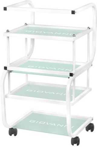 Stolik kosmetyczny 1012Estetyczny stolik pod urządzenie kosmetyczne, metalowo-szklany, z kółkami. Posiada cztery szklane półki.na szkalnych półkach wygrawerowane logo GIOVANNI Wymiary:- wymiary stolika 48*44,5*82 cm- waga stolika 12,5 kg- odległość między półkami 20,5; 14; 17,5 cm Dane techniczne:- kolor biały - szklane półki - gumowane kółka 4 szt.- wymiary opakowania 51,5*45*13 cm- waga brutto 15 kg- ilość opakowań 1