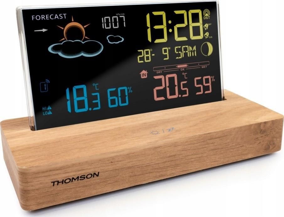 Thomson Stacja pogodowa z budzikiem CT610 Odkryj naszą nową stację pogodową z budzikiem, technologiczny klejnot zaprojektowany po to, aby zapewnić Ci kompleksowy i spersonalizowany dostęp do informacji o pogodzie. Bezprzewodowa sonda : Monitoruj warunki pogodowe na zewnątrz za pomocą wydajnej i precyzyjnej bezprzewodowej sondy. Temperatura wewnętrzna: Wyświetlanie w stopniach Celsjusza i Fahrenheita, co umożliwia łatwy i natychmiastowy odczyt temperatury w pomieszczeniu. Higrometria : Aby zapewnić sobie optymalny komfort, kontroluj poziom wilgotności w domu. Prognoza pogody i fazy księżyca : Bądź na bieżąco z nadchodzącymi warunkami pogodowymi i fazami księżyca, bezpośrednio na swojej stacji. Wyświetlanie czasu w formacie 12/24-godzinnym : Wybierz format czasu, który najbardziej Ci odpowiada. Podwójny alarm : Ustaw dwa oddzielne alarmy, aby uzyskać maksymalną elastyczność planowania. Drzemka : Ciesz się kilkoma dodatkowymi minutami snu dzięki funkcji drzemki. Kalendarz: Zobacz datę na pierwszy rzut oka. Kolorowy, podświetlany wyświetlacz : Wyraźny, atrakcyjny wyświetlacz, który pasuje do Twojego domu. Ściemniacz o 4 poziomach intensywności : Dostosuj jasność ekranu zgodnie ze swoimi preferencjami i atmosferą w pomieszczeniu. Ta stacja pogodowa z budzikiem to idealne narzędzie, aby dobrze rozpocząć dzień. Niezależnie od tego, czy chcesz sprawdzić pogodę, zarządzać swoim harmonogramem, czy po prostu dodać odrobinę nowoczesności do swojego wnętrza, spełni wszystkie Twoje potrzeby. Parametry techniczne : Wyświetlacz LCD z kolorowym podświetleniem i regulacją jasności (4 poziomy) wyświetlanie temperatury wewnętrznej i zewnętrznej (°C lub °F) higrometr czas sterowany sygnałem DCF format wyświetlania czasu 12/24 zintegrowany barometr wyświetlacz faz księżyca wyświetlanie dnia tygodnia podwójny budzik Funkcja drzemki – opóźniony alarm kalendarz wskaźnik niskiego poziomu baterii Wymiary: 17,2 x 8 x 10 cm (szer. x gł. x wys.) waga: 0,32 kg
