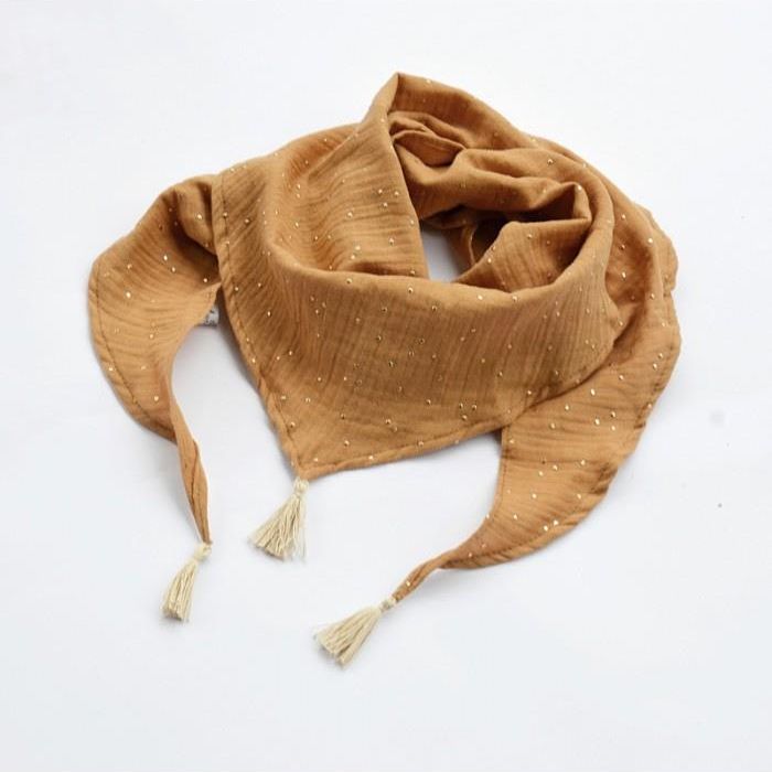 Chusta muślinowa pod szyję dla dzieci chwosty karmel złote kropki Gryfino
