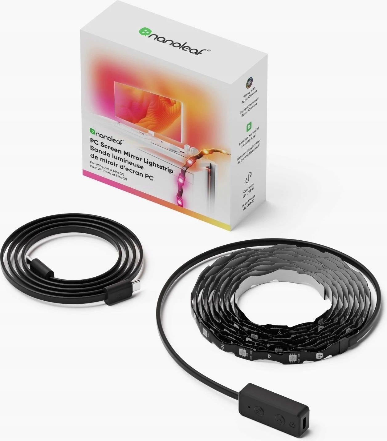 Nanoleaf 4D PC Screen Mirror Lightstrip - system inteligentnego podświetlenia monitora do 32" (2,5 m) Zanurz się w grze – immersyjne podświetlenie monitora w czasie rzeczywistym Nanoleaf 4D PC Screen Mirror Lightstrip to rewolucyjny system podświetlenia monitora, który rozszerza akcję z ekranu na całe Twoje stanowisko. Dzięki dynamicznej synchronizacji obrazu i światła, każdy wybuch, błysk czy pulsujący efekt specjalny staje się częścią otoczenia. Technologia Screen Mirror przenosi Cię do wnętrza gry, filmu lub koncertu, zwiększając wrażenia wizualne i emocjonalne. Pełna synchronizacja z muzyką – światło, które tańczy z rytmem Funkcja Orchestrator analizuje muzykę w czasie rzeczywistym i dopasowuje efekty świetlne do tempa oraz nastroju utworu. Twoje biurko zamienia się w pulsujące centrum rozrywki, a każda playlista nabiera nowego, energetycznego wymiaru. Idealne rozwiązanie na imprezy, wieczorne sesje gamingowe lub chwile relaksu z muzyką. Personalizowane efekty świetlne – miliony kolorów i gotowe sceny Twórz swój klimat z paletą ponad 16 milionów kolorów oraz szerokim zakresem temperatury barwowej (od 2700K do 6500K). Wybieraj spośród gotowych scen lub korzystaj z bogatej biblioteki motywów stworzonych przez społeczność Nanoleaf. Dzięki 75 niezależnym strefom LED, każdy centymetr listwy może świecić w innym kolorze – dla uzyskania efektu totalnej immersji. Łatwy montaż na każdym monitorze – idealne dopasowanie do 32” Listwa Nanoleaf 4D została zaprojektowana z myślą o łatwym i szybkim montażu. Dzięki elastycznej konstrukcji Zigzag, idealnie dopasowuje się do krawędzi monitora o przekątnej do 32 cali. Możliwość przycinania ułatwia precyzyjne dopasowanie długości. Montaż jest banalnie prosty – wystarczy przykleić listwę do tyłu monitora i gotowe. Bez wiercenia, bez narzędzi. Sterowanie bez wysiłku – aplikacja i fizyczny kontroler Obsługa listwy świetlnej jest intuicyjna i szybka. Korzystaj z aplikacji Nanoleaf Desktop App na Windows lub Mac, aby zarządzać wszystkimi funkcjami, scenami i jasnością. Możesz też używać fizycznego przycisku na kontrolerze, by włączyć lub wyłączyć światło bez potrzeby sięgania po komputer. Pełne sterowanie w zasięgu ręki – od 1% do 100% jasności. Specyfikacja techniczna – poznaj możliwości Nanoleaf 4D Wymiary i waga Długość listwy: 250 cm × 1 cm × 2,3 mm Wymiary kontrolera: 47,11 × 18,8 × 13,22 mm Waga listwy LED: 0,155 kg Waga kabla USB-C: 0,058 kg Długość kabla USB-C: 1,5 m Odległość między diodami LED: 33,33 mm Ogólne parametry Możliwość przycinania: Tak Możliwość przedłużania: Nie Zastosowanie: Do użytku wewnętrznego Stopień ochrony: IP20 Jasność maksymalna: 300 lumenów (przy 2,5 m długości) Kolory i LED-y Liczba kolorów: Ponad 16 milionów (RGB multikolor) Temperatura barwowa: 2700K – 6500K Liczba stref kolorystycznych: 75 Liczba diod LED: 75 Zasilanie i trwałość Moc maksymalna: 10W Napięcie wejściowe: 5V Żywotność: do 25 000 godzin Zakres temperatury pracy: 0°C – 40°C Wilgotność robocza: 10% – 90% Sterowanie i funkcje użytkowe Ściemnianie: Tak (zakres 1% – 100%, przez aplikację) Sposób sterowania: Aplikacja Nanoleaf Desktop App (Windows, Mac) Fizyczny przycisk na kontrolerze Dlaczego warto wybrać Nanoleaf 4D do podświetlenia monitora? Rewolucyjna technologia Screen Mirror dla graczy i kinomanów Pełna synchronizacja z muzyką i dynamiczne efekty świetlne Intuicyjna obsługa i natychmiastowa instalacja (Plug & Play) Bogata personalizacja dzięki aplikacji i wsparciu społeczności Kompaktowy design i łatwe dopasowanie do monitora 32” Zamień zwykłe biurko w interaktywną przestrzeń – z Nanoleaf 4D każda chwila nabiera koloru.