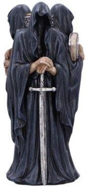 Świecznik Endkeepers od Nemesis Now to efektowny, gotycki element dekoracyjny przedstawiający trzy postacie w szatach i kapturach, zgromadzone wokół centralnego świecznika. Każda postać trzyma inny symboliczny przedmiot: miecz, czaszkę i księgę symbolizującą moc, śmiertelność i wiedzę. Ta przejmująco piękna rzeźba łączy w sobie funkcjonalność i tajemniczość. Dzięki temu stanowi wyjątkowy element każdej kolekcji wyposażenia wnętrz w stylu dark fantasy lub alternatywnym.
