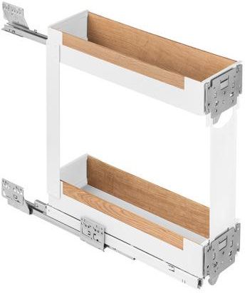Pinello Cargo Liro z drewnem 200/ 2/ białe małe cargo dwu-półkowe do wąskich przestrzeni przy zlewie i kuchence Pinello Liro Cargo 200 w kolorze białym z półkami wykończonymi dębowymi listewkami to nowoczesne cargo kuchenne, które zostało stworzone z myślą o maksymalnym wykorzystaniu małych przestrzeni wokół zlewu. Niezależnie od tego, czy system jest zamontowany po lewej, czy prawej stronie użytkownika, jego obsługa jest równie wygodna, a umieszczenie prowadnic pod półkami czyni je praktycznie niewidocznymi, zachowując estetykę w szafce. System ten jest przeznaczony do montażu z frontami wyposażonymi w uchwyty meblowe, ale również do szafek bezuchwytowych – w takim przypadku wymaga dodatkowego montażu mechanizmu push to open, który można nabyć osobno. Cargo Pinello Liro Cargo posiada prowadnice z pełnym wysuwem. Pinello Liro Cargo 200 ma wbudowany hamulec Softclose, który gwarantuje płynne i bezgłośne zamykanie systemu. Dolna prowadnica jest mocowana po lewej stronie korpusu, a górna po prawej, co daje sztywność ramie i zapewnia doskonałą płynność wysuwania. Białe półki wykonane z wysokiej jakości blachy stalowej są łatwe w utrzymaniu czystości, a dodatkowe silikonowe maty na dnie półek zapewniają ochronę półki i wygodę użytkowania. Dębowe relingi tworząc produkt, który wyróżnia się jakością, trwałością i unikalnym designem. Ciepły odcień drewna doskonale komponuje się z różnymi aranżacjami kuchennymi, od klasycznych po nowoczesne. Pinello Liro Cargo 200 to doskonałe połączenie funkcjonalności, estetyki i jakości, które sprawia, że każda kuchnia staje się bardziej ergonomiczna i zorganizowana. To rozwiązanie, które docenią zarówno miłośnicy nowoczesnego designu, jak i osoby, które cenią sobie maksymalne wykorzystanie dostępnej przestrzeni. Parametry techniczne Marka / Producent Producent PEKA Wykończenie Materiał mechanizm: stalmaty: tworzywo sztucznereling: barierka drewniana Powierzchnia malowana proszkowo Kolor biały Linia koszy Liro z drewnem Model Cargo Wymiary Wysokość światła szafki min. 525 mm Szerokość światła szafki 162 - 168 mm Głębokość światła szafki min. 506 mm Szerokość drzwi 200 mm Obciążenie Obciążenie całego systemu 30 kg Obciążenie na półkę 10 kg Rodzaje mocowań Śruby montażowe brak (do dokupienia) Sposób montażu Montaż w szafce podblatowejdo korpusu i frontu Sposób mocowania za pomocą wkrętówzalecane przez producenta Ø4 x 16 mm Ø7,5 x 14 mm szczegóły w inst. montażu Składniki zestawu Elementy zestawu 1 x mechanizm (rama z koszami)2 x maty silikonowe4 x listewki dębowe1 x prowadnice Nova Pro L500 mm2 x mocowania frontu3 x zestawy podkładek Hamulec zintegrowany Softclose(płynne i ciche zamykanie) Opakowanie Ilość paczek 1 Waga opakowania 9 kg Wymiary opakowania 170 x 510 x 510 mm