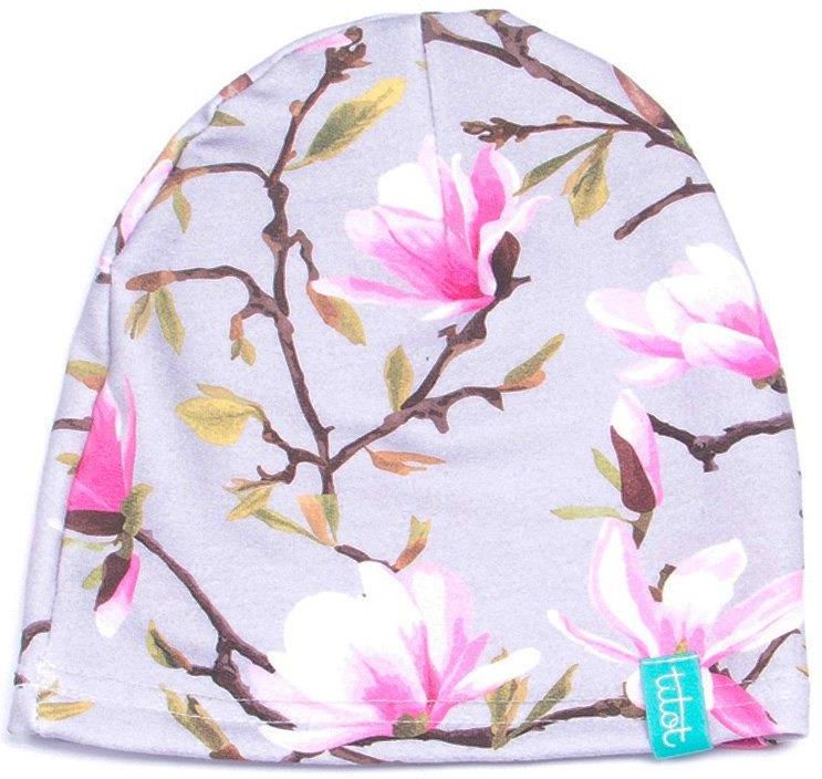 Titot Magnolia Flowers . Pojedyncza czapka wykonana z miękkiej, elastycznej dzianiny. Czapka nie uciska głowy dziecka, znakomicie zakrywa uszy chroniąc przed wiatrem. Do czapeczki można dopasować komin.Skład: 95% bawełna, 5% elastanW