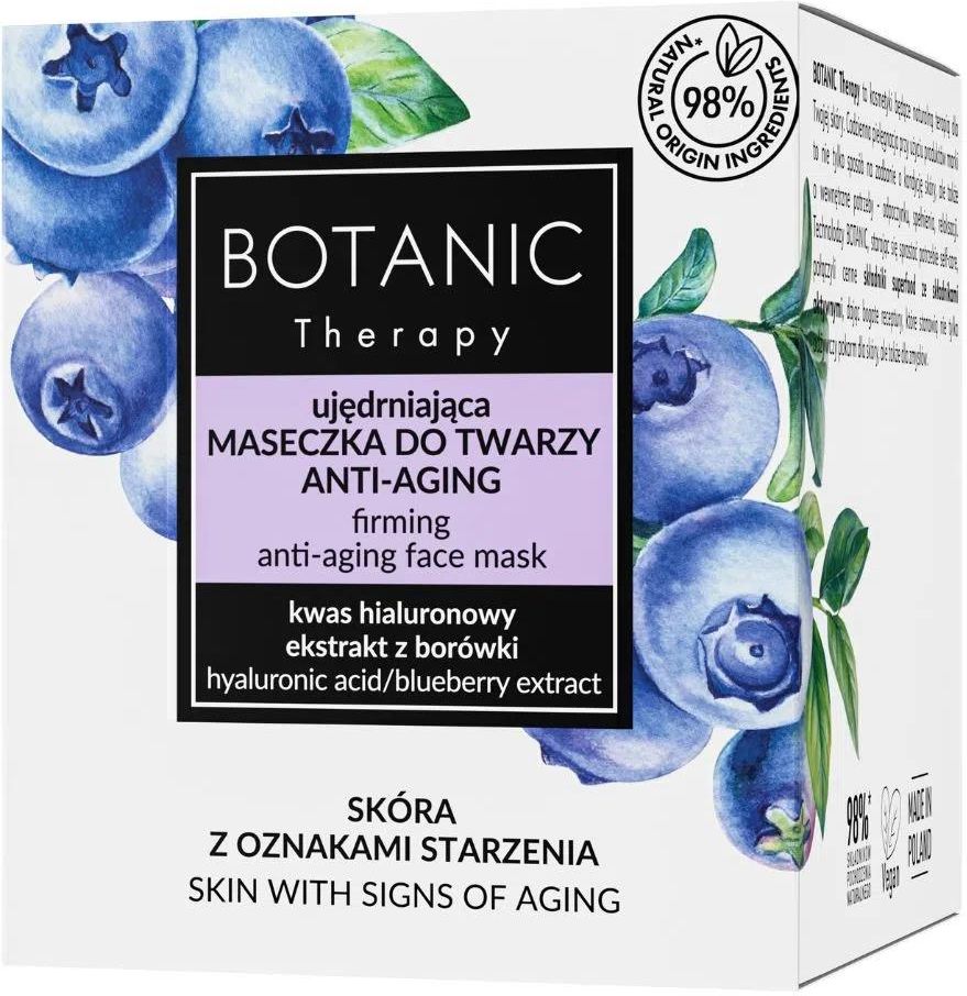 Botanic ujędrniająca maseczka do twarzy anti-aging z kwasem hialuronowym i ekstraktem z borówki – skóra z oznakami starzeniaBOTANIC Therapy to kosmetyki będące naturalną terapią dla Twojej skóry. Codzienna pielęgnacja przy użyciu produktów marki to nie tylko sposób na zadbanie o kondycję skóry, ale także o wewnętrzne potrzeby - odpoczynku, spełnienia, relaksacji. Technolodzy BOTANIC, starając się sprostać potrzebie self-care, połączyli cenne składniki superfood ze składnikami aktywnymi, dając bogate receptury, które stanowią nie tylko odżywczy pokarm dla skóry, ale także dla zmysłów.Ujędrniająca maseczka do twarzy anti-agingReceptura maski stanowi naturalną terapię dla Twojej zmęczonej, pozbawionej sprężystości skóry. Dzięki połączeniu ekstraktu z borówki, oleju z awokado wraz z kwasem hialuronowym i ceramidami, intensywnie odżywia skórę oraz wspomaga procesy jej regeneracji. Działa wygładzająco, poprawia jędrność i elastyczność, spowalniając procesy przedwczesnego starzenia się skóry. Po użyciu Twoja skóra jest odpowiednio nawilżona, ukojona i gładka.Sposób użyciaNanieś maseczkę na skórę twarzy, szyi i dekoltu. Po 15 minutach nadmiar usuń wacikiem. Stosuj 2-3 razy w tygodniu.Produkt przebadany dermatologicznie98% składników pochodzenia naturalnegoZmiana barwy produktu uwarunkowana jest wysoką zawartością składników pochodzenia naturalnego.Działanie składników naturalnych i aktywnych KWAS HIALURONOWY intensywnie nawilża skórę, poprawia jej elastyczność. CERAMIDY NP regenerują oraz wzmacniają naturalną barierę hydrolipidową naskórka. EKSTRAKT Z BORÓWKI posiada właściwości ujędrniające. OLEJ Z AWOKADO działa regenerująco i łagodząco.
