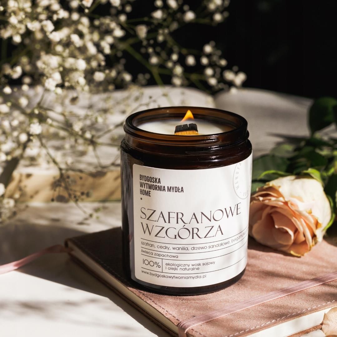 BYDGOSKA WYTWÓRNIA MYDŁA SZAFRANOWE WZGÓRZE ŚWIECA SOJOWA - ŚREDNIA marka: Bydgoska Wytwórnia Mydła objętość: 180 ml czas palenia: 40 h Ta wyjątkowa świeca sojowa to prawdziwe arcydzieło wśród zapachowych doznań. Jej subtelny płomień oświetla pomieszczenie delikatnie, tworząc przyjemny i relaksujący nastrój. Zapach Szafranowego Wzgórza to zmysłowe połączenie najszlachetniejszych składników natury. Początkowo wyczuwamy unoszącą się nutę szafranu, wprowadzając do wnętrza nuty wyrafinowanej elegancji. Nuta cedru, drzewa sandałowego oraz bergamotki otulają aromatem i nadają kompozycji głębokości i wyważonej harmonii. W finale, nuta wanilii i piżma nadaje całości wyjątkowej subtelności i łagodności. To połączenie tworzy niezwykłą atmosferę, która wprowadza spokój i harmonię do Twojego otoczenia. Świeca wykonana jest z naturalnego, niespienionego wosku sojowego, co sprawia, że jest bardziej przyjazna dla środowiska, a także zapewnia dłuższy czas palenia. Eleganckie opakowanie doskonale komponuje się z każdym wystrojem wnętrza, dodając mu subtelności i elegancji. Rozpal tę świecę i pozwól sobie na chwilę wspaniałego relaksu przy magii Szafranowego Wzgórza. Skład: certyfikowany wosk sojowy, kompozycje zapachowe, knot drewniany. Produkt polski, wykonywany ręcznie (hand made), wegański. Ważne Knot drewniany należy przycinać przed zapaleniem do dł. ok. 3-4 mm ponad poziom wosku. Świeca nie wypala się nigdy do końca z uwagi na mocowanie knota. Świeca powinna stać na podkładce lub talerzyku. Nie umieszczaj jej w przeciągu i w pobliżu materiałów łatwopalnych. Dlaczego warto kupować w naszym sklepie? bezpieczna przesyłka w duchu less waste - przykładamy dużą wagę do tego aby zamówione produkty dotarły nieuszkodzone. Do pakowania paczek używamy naturalnych materiałów (tekturowe kartony, biodegradowalny skropak, papierowa taśma). Bez zbędnego plastiku. próbki gratis - już przy zakupie dwóch sztuk produktów dostaniesz od nas próbkę kosmetyku gratis. Przy większej ilości zamówionych sztuk liczba próbek się zwiększa.