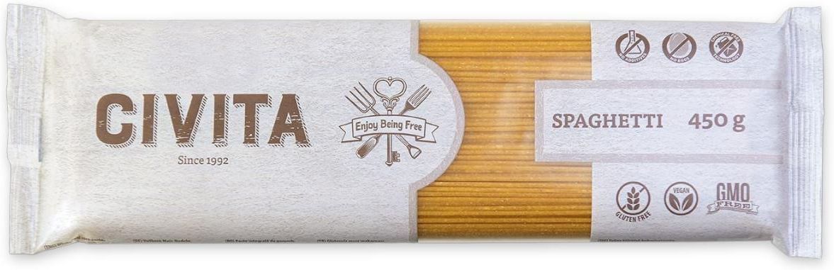 MAKARON KUKURYDZIANY SPAGHETTI BEZGLUTENOWY W Civita pracujemy, aby tworzyć produkty umożliwiające każdemu pełnowartościowe odżywianie bogate w błonnik, wolne od GMO i dodatków chemicznych. Nasze produkty wytwarzane są w specjalnie przystosowanym zakładzie bezglutenowym, gdzie do produkcji używamy jedynie wody i 100% mąki kukurydzianej, pochodzącej z kukurydzy uprawianej przez lokalnych rolników. Masa netto: 450 g Składniki: mąka kukurydziana 100%. Kraj pochodzenia: Węgry Sposób użycia: Makaron wrzucić do wrzącej i osolonej wody z niewielką ilością oleju. Gotować 6-10 minut od czasu do czasu mieszając. Najlepiej smakuje podany świeżo po przygotowaniu. Warunki przechowywania: Przechowywać w suchym, chłodnym i ciemnym miejscu. Wartość odżywcza w 100 g produktu: Wartość energetyczna: 1435 kJ/ 338 kcal Tłuszcz: 0,85 g - w tym kwasy tłuszczowe nasycone: 0,2 g Węglowodany: 75,83 g - w tym cukry: 0,81 g Błonnik: 3,02 g Białko: 5,32 g Sól: 0,05 g