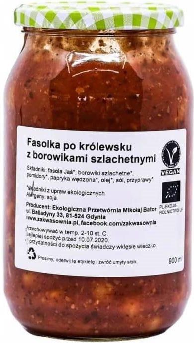 FASOLKA PO KRÓLEWSKU Z BOROWIKAMI BIO 900 ml - DELIKATNA DELIKATNA (kombucha, kimchi, zakwas) SKŁADNIKI woda, fasola Jaś* 22 %, borowiki* 8 %, olej słonecznikowy*, koncentrat pomidorowy*, cukier*, ocet balsamiczny* (ocet winny*, zagęszczony i gotowany moszcz winogronowy*), papryka wędzona*, …
