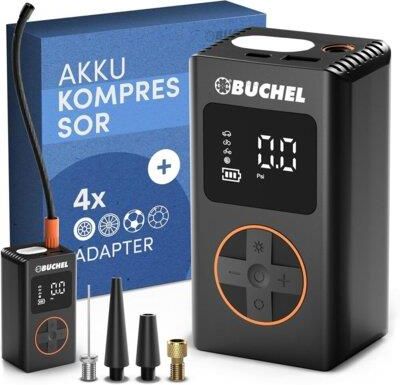 Przenośna pompka BUCHEL zapewnia szybkie, bezprzewodowe działanie i automatycznie wyłącza się po osiągnięciu ustawionego ciśnienia.