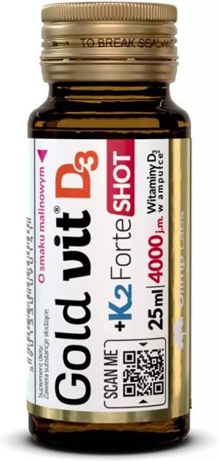 Olimp Gold-Vit D3+K2 Forte shot to wyjątkowy preparat witaminowy o pysznym, malinowym smaku. Produkt zawiera kombinację witamin D3 i K2, które mają korzystny wpływ na układ kostny, wspomagają prawidłowe funkcjonowanie mięśni i gospodarkę wapniowo-fosforanową. Shot witaminowy Olimp to również nieocenione wsparcie dla układu odpornościowego. Płynna postać preparatu gwarantuje wysoką przyswajalność zawartych w nim składników i ich skuteczne działanie. Olimp Gold-Vit shot o smaku malinowym to świetna propozycja szczególnie dla osób, dla których stosowanie kapsułek i tabletek wiąże się z dyskomfortem. Bez wątpienia Olimp Gold-Vit D3+K2 Forte shot to doskonałe uzupełnienie diety w składniki ważne dla zachowania zdrowia kości i mięśni.
