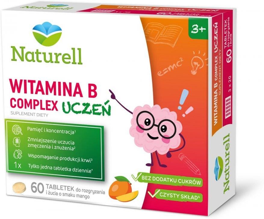 Opis Naturell Witamina B Complex Uczeń to suplement diety w postaci tabletek do rozgryzania i żucia, pakowany po 60 tabletek, przeznaczony jako wsparcie dla młodzieży i osób potrzebujących wygodnej formy suplementacji witamin z grupy B. Składniki substancje słodzące: sorbitole, ksylitol; substancja glazurująca: kwasy tłuszczowe; średniołańcuchowe kwasy tłuszczowe; aromat naturalny; regulator kwasowości: kwas cytrynowy; D-pantotenian wapnia (kwas pantotenowy); L-metylofolian wapnia (kwas foliowy); chlorowodorek pirydoksyny (witamina B6); monoazotan tiaminy (tiamina); ryboflawina; D-biotyna (biotyna); metylokobalamina (witamina B12). 1 tabletka zawiera Tiamina (witamina B1) 0,5 mg* (45,5% RWS) Ryboflawina (witamina B2) 0,5 mg* (35,7% RWS) Kwas pantotenowy (B5) 3,6 mg* (60% RWS) Witamina B6 1 mg* (71,4% RWS) Kwas foliowy (witamina B9) 150 μg (75% RWS) Witamina B12 1,25 μg (50% RWS) Biotyna (witamina B7) 25 μg (50% RWS) * brak Referencyjnej Wartości Spożycia RWS - Referencyjna Wartość Spożycia Charakterystyka Preparat wspiera prawidłowe funkcjonowanie układu nerwowego, pomaga zmniejszyć uczucie zmęczenia i znużenia oraz bierze udział w metabolizmie energetycznym, co czyni go odpowiednim dla uczniów i osób aktywnych umysłowo oraz fizycznie. Stosowanie witamin z grupy B wspomaga: pamięć i koncentrację, zmniejszenie uczucia zmęczenia i znużenia, prawidłową produkcję krwi, utrzymanie prawidłowego metabolizmu energetycznego, prawidłowe funkcjonowanie układu nerwowego, prawidłowy metabolizm homocysteiny. Stosowanie Dzieci powyżej 3. roku życia – 1 tabletka dziennie. Dorośli – 2 tabletki dziennie. Tabletkę należy rozgryźć. Nie wymaga połykania w całości ani popijania. Przeciwwskazania Nie stosować w przypadku nadwrażliwości na którykolwiek składnik preparatu. Nie zaleca się stosowania u kobiet w ciąży i karmiących bez konsultacji z lekarzem. Ostrzeżenia i środki ostrożności Nie przekraczać zalecanej porcji do spożycia; spożycie w nadmiernych ilościach może wywołać efekt przeczyszczający ze względu na obecność polialkoholów takich jak sorbitol. Działania niepożądane Możliwe reakcje nietolerancji indywidualnej na składniki preparatu; przy wystąpieniu niepokojących objawów przerwać stosowanie i skonsultować się z lekarzem lub farmaceutą. Przechowywanie Przechowywać w oryginalnym opakowaniu w suchym miejscu, w temperaturze pokojowej, z dala od małych dzieci i światła. Producent USP Zdrowie Sp. z o.o. ul. Poleczki 35 02-822 Warszawa