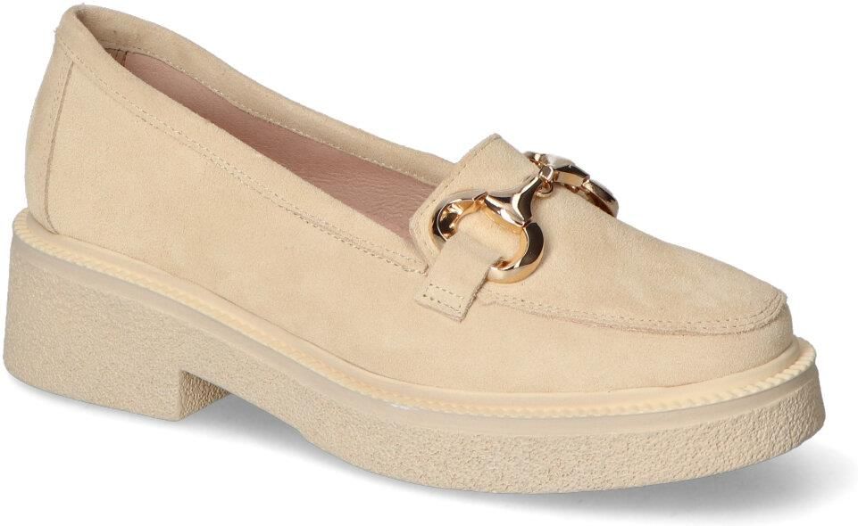 Mokasyny popularnej marki Lewski: - cholewka wykonana została ze skóry naturalnej zamszowej - wnętrze zostało pokryte skóra naturalną aby zapewnić komfort podczas użytkowania - wkładka wewnętrzna wykonana została ze skóry naturalnej - obcas o wys. 3 cm zapewnia odpowiednią stabilizację - beżowy kolor, złota ozdoba i modny fason tworzą efekt, który zachwyci każdego!