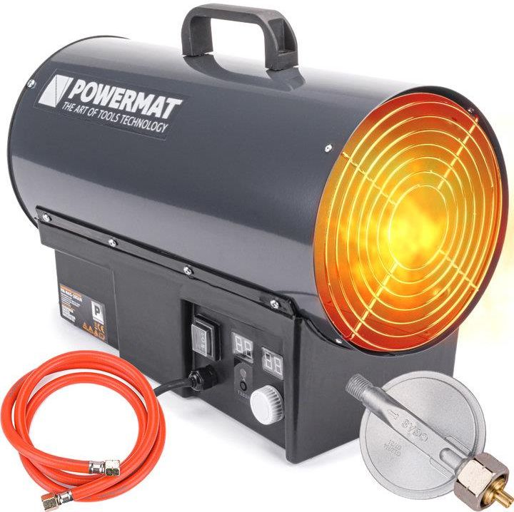 Specyfikacja techniczna Producent: Powermat Moc: 25000 W Moc wentylatora: 30 W Zasilanie: 230 V / 50 Hz Przepływ powietrza: 520 m³/h Ciśnienie robocze gazu: 0,7 bar Maksymalne zużycie gazu: 1,09 kg/h Stopień ochrony regulatora: IP44 Długość węża do butli gazowej: 150 cm Długość przewodu zasilającego: 140 cm Wymiary urządzenia: 455 x 220 x 340 [mm] Waga nagrzewnicy: 5,2 kg Wyposażenie Nagrzewnica gazowa 25 KW Wąż gumowy o długości 1400 mm Reduktor ciśnienia do butli gazowej Instrukcja obsługi PL Ergonomia Wbudowany 5-łopatkowy wentylator o wysokiej wydajności zapewni przepływ powietrza do 520 m³/h. Wysokiej klasy silnik, wbudowany zapłon piezoelektryczny oraz zabezpieczenie przed przegrzaniem odcinające dopływ gazu zagwarantuje wydajną i bezpieczną pracę. Nagrzewnicę można podłączyć do 5 lub 11 kg butli gazowej na propan/butan. Nagrzewnica gazowa doskonale sprawdzi się podczas ogrzewania warsztatów, hal, magazynów itp.