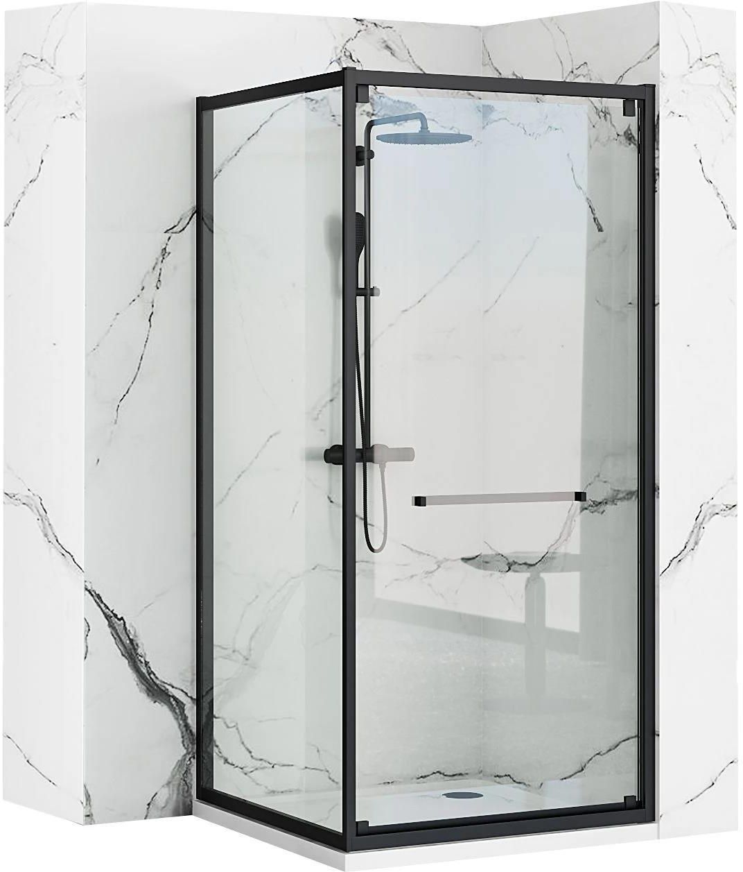 Kabina prysznicowa Space IN Black 90x90 Typ kabiny: Narożna Rozmiar kabiny: 88,5 x 88,5 cm Wysokość kabiny: 195cm Szerokość wejścia: 83 cm Materiał profili: Aluminium Wykończenie: Czarny mat Kolor szkła: Transparent Rodzaj rolek: Łożyskowane Sposób otwierania: Przesuwne do wewnątrz - Autoline …