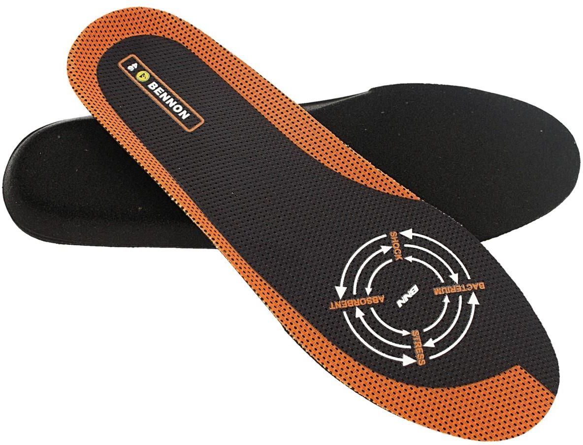Wkładki do butów Bennon Absorba XTR ESD (D41201) Rozmiar 46 Anatomicznie wyprofilowane wkładki mające właściwości antystatyczne. Uniwersalne, przeznaczone do różnego typu aktywności. Odpowiednio wyprofilowany obszar pięty zapewnia stopom komfort podczas długotrwałego użytkowania np. w trakcie wielogodzinnych marszów. Wykonane zostały z lekkiej pianki poliuretanowej Hi-Poly, wykazującej właściwości absorpcyjne oraz tkaniny Mesh charakteryzującej się siatkową strukturą. Połączenie materiałów zapewnia wysoką oddychalność i odporność na ścieranie. Wkładki zawierają aktywny węgiel, który pochłania wilgoć i ma właściwości eliminujące przykre zapachy. Dane techniczne Kolor: czarny/pomarańczowy Materiał: pianka Hi-Poly, tkanina MESH Producent: Bennon, Czechy