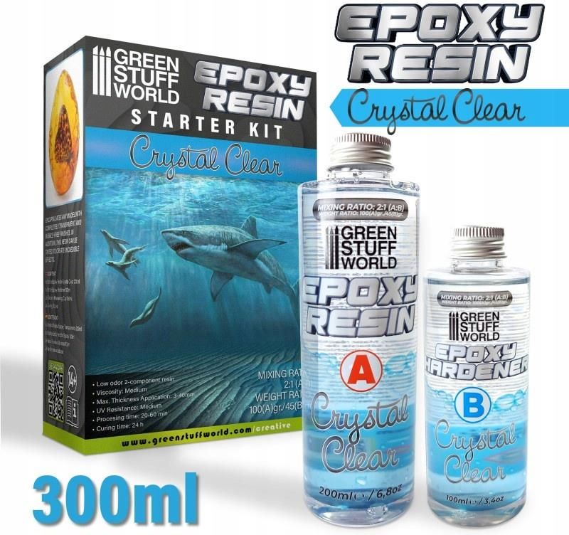 Transparent Epoxy Resin Epoxy resin is a synthetic material that finds use in a wide range of art and craft projects such as model building, water effects, jewelry, encapsulations, and quick repairs. Due to its transparency and hardness, this is an especially popular material for creating various effects in miniatures, wargames, and dioramas. To create the epoxy resin mix, two components are carefully mixed together. The liquid epoxy resin and hardener initiate a chemical reaction that typically takes 24 hours to complete. It is crucial to mix the components precisely to avoid any unwanted outcomes such as uncured mixes, excessively long curing times, or flexible cured pieces. For proper mixing, the components should be stirred together thoroughly with a wooden stick or spoon. Shaking the mixture should be avoided to prevent the formation of air bubbles that will persist. The duration during which epoxy resins can be processed after mixing is referred to as the processing time. It varies depending on the amount of epoxy resin mixed. Larger amounts will result in shorter processing times, which typically last between 20 to 60 minutes. A warm environment will accelerate the reaction, reducing working time, while a cold environment will prolong it. Dyes for Resins can be incorporated into the mixture, as well as a variety of fillers including pigments and glitter powders among others. However, it's important to ensure that the fillers used are resistant to the high temperatures produced during curing and are compatible with this product. Low-odor 2-component epoxy resin Resin Viscosity: Medium Maximum thickness application: 3-40mm UV Resistance: Medium Processing time: 20-60min Curing time: 24h Content: - 300ml (200 + 100ml) - 2 silicone mixing glasses - 2 wooden sticks for mixing How do you make clear resin without bubbles? Although working with these types of epoxy resins is generally a fairly simple process, getting clear pieces without bubbles does require some preparation, attention to detail, and following the manufacturer's instructions in terms of times, mixing ratios, and quantities. Here are some general tips to help minimize bubbles: Work in a warm and dust-free environment: Choose a room with a warm temperature and low humidity to minimize air pockets in the application. Clean the work area to avoid dust particles from getting into the mixture. Mix both components slowly to avoid creating air bubbles. Mix thoroughly but avoid whipping the mixture to prevent introducing air into the mix. Use a heat gun or torch: Use a heat gun or torch whenever possible to carefully and briefly pass it over the surface of the mixed product to remove any surface bubbles. This process should be done with caution to avoid overheating or scorching whatever you are encapsulating. Allow the mixture to rest: After mixing, let the mixture rest for a few minutes before pouring it to allow air bubbles to rise to the surface. Pour the mixture slowly and steadily into the mold or surface, and avoid splashing it around. This can help minimize the introduction of new bubbles. Use a vibrating tool: If you have it because a vibrating tool or a sander with a vibration mode can help release any trapped air bubbles in the mixture. Cover and let it cure: After pouring the mixture, cover it with a lid or plastic wrap to avoid dust and other debris from settling on the surface. Allow curing for the recommended time in the instructions.