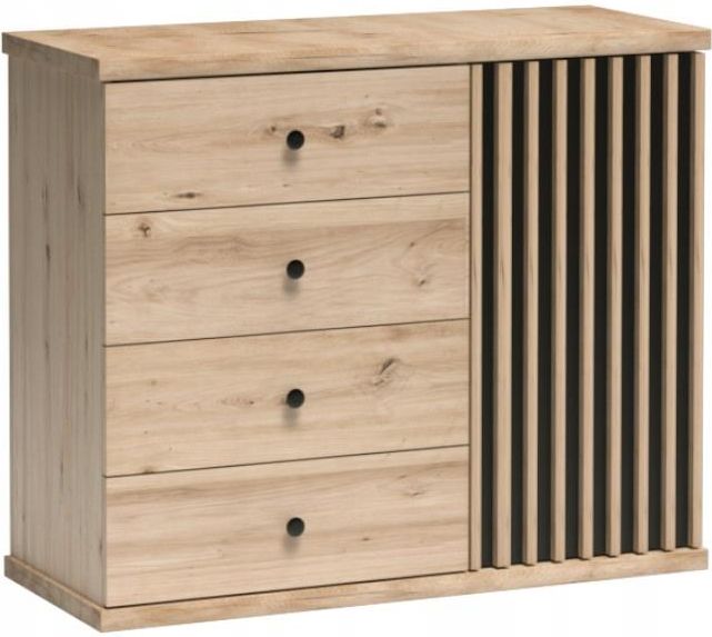 CALI-Ca_05 - mała komoda 101 z szufladami - kolorystyka: ARTISAN + CZARNY - wymiary: 101,6 x 85,4 x 40,6 (szer. x wys. x gł. w cm) CALI-Ca_05 – 101,6 x 85,4 x 40,6 – mała komoda sprawdzi się w każdym pomieszczeniu zarówno w salonie na drobiazgi jak również w sypialni na bieliznę, komoda składa się z czterech szuflad oraz dwóch półek ukrytych za frontem. Cechy całego systemu CALI: laminowana płyta wiórowa artisan + czarny spody oraz blaty brył z płyty 32mm fronty i pozostałe elementy z płyty 16mm czarne fronty z płyty 16mm + lamele 16mm z listew MDF w dekorze artisan jedna z lameli w drzwiach przycięta pod kątem ułatwia otwarcie frontu bryły w której zastosowano to unikatowe rozwiązani plecy i spody szuflad z płyty HDF wszystko oklejone odporną na drobne uszkodzenia estetyczną okleiną PCV wysokiej jakości prowadnice z pełnym wysuwem oraz zawiasy z systemem cichego domyku hartowane szło w drzwiach witryn metalowe czarne uchwyty w drzwiach i szufladach meble w paczkach z załączonymi instrukcjami i niezbędnymi do zmontowania akcesoriami od polskiego producenta Dodatkowo: Możliwość oświetlenia witryn – dodatkowo w aukcji Nogi metalowe czarne o wysokości 10cm – dodatkowo w aukcji Charakterystyczne detale systemu CALI: