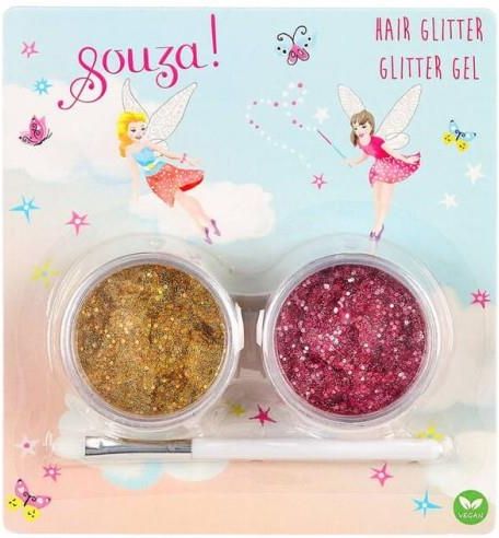 Zestaw brokatów do włosów dla dzieci holenderskiej marki Souza! składa się z 2 pojemniczków z brokatem w żelu (fuksjowym i złotym, po 15 g każdy) oraz aplikatora z miękką końcówką. Przetestowany dermatologicznie, w pełni bezpieczny, nie uczula, nie podrażnia i nie wysusza skóry głowy. Brokat łatwo się zmywalna ciepłą wodą z szamponem. Idealny na przyjęcia, urodzinki, zabawę w salon kosmetyczny oraz jako stylowy prezent. Produkt w 100% wegański i nie testowany na zwierzętach. wiek: 3+ skład: 100% wegańskie design: Holandia wymiary opakowania: 14 x 7 x 1 cm bezpieczeństwo: EC 1223/2009, EC 1272/2008 O marce: Souza! to holenderska marka, oferująca przebrania i szeroki wybór akcesoriów dla dzieci. Sukienki wizytowe, kostiumy, pantofelki, peleryny, skrzydła, tiary, biżuteria, maski, korony, kapelusze, tarcze, torebki, różdżki, spinki i kosmetyki tworzą wyjątkowe radosne kolekcje. W Souza! wszystko kręci się wokół fantazji i wyjątkowego designu, nieustannie inspirowanego nieskończonymi możliwościami, jakie daje łączenie materiałów i kolorów. Wysokiej jakości tiulowe sukienki, kostiumy czy pantofelki to propozycje nie tylko na karnawał, ale również do noszenia na co dzień przez cały rok, czy przy okazji różnych uroczystości. Całości dopełniają w pełni bezpieczne, nieuczulające, wegańskie kosmetyki dla dzieci i bogata oferta ozdób do włosów, tak lubianych przez małe dziewczynki! Wejdź do dziecięcego świata fantazji z Souza!