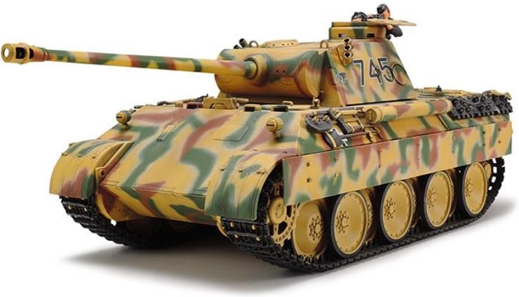 Model German Tank Panther Ausf.D Pz.Kpfw.Panther Ausf.D (Sd.Kfz.171) Tamiya - nr. 35345 - scale 1:35 Niemiecki czołg Panther Ausf. D. Plastikowy model pojazdu wojskowego do sklejania i pomalowania. Klej modelarski do plastiku oraz farby należy dokupić dodatkowo - model ich nie zawiera. Model z firmy Tamiya nr katalogowy 35345 wykonano w skali 1/35. Model zawiera m.in. 1 figurkę żołnierza, gumowe gąsienice, kalkomanie. Wymiary modelu: długość ok. 254 mm, szerokość ok. 101 mm. Wymiary opakowania modelu do sklejania Tamiya 35345: 38,5 x 24,5 x 6 cm. Do modelu można dodatkowo dokupić: metalową lufę Tamiya 12664, plastikowe gąsienice Tamiya 12665, elementy fototrawione Tamiya 12666.