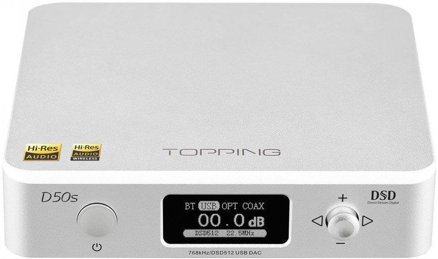 Najważniejsze cechy: • wyposażony w wyświetlacz OLED o przekątnej 0,96 cala • kompatybilny z systemami operacyjnymi Windows (7 lub wyższy), iOS, MAC i Android • obudowa wykonana z jednego bloku aluminium • bluetooth 5.0 z obsługą LDAC • certyfikat Hi-Res Audio, CE, ROHS i FCC Jest to nowa wersja wyposażona w Bluetooth 5.0 z obsługą LDAC. Wyposażony w wyświetlacz OLED Topping D50s to wysokiej klasy DAC USB z wyjściem liniowym, optycznym i koncentrycznym, do tego jest wyposażony w wyświetlacz OLED o przekątnej 0,96 cala. Wykorzystuje XMOS (XU208), 2 x ES9038Q2M + 3 x OPA1612 i niestandardowe sterowniki zapewniające wsparcie dla DSD512 i PCM 32bit / 768 kHz. Certyfikat Hi-Res Audio, CE, ROHS i FCC D50s jest kompatybilny z systemami operacyjnymi Windows (7 lub wyższy), iOS, MAC i Android, pozwala na synchronizację włączania i wyłączania z komputerem. Obudowa D50s jest wykonana z jednego bloku aluminium. Jest to nowa wersja wyposażona w Bluetooth 5.0 z obsługą LDAC. D50 posiada certyfikaty Hi-Res Audio, CE, ROHS i FCC. DANE TECHNICZNE Producent Topping Model D50s Wyjście RCA Balans 0,09 dB Szum <2uvrms> Wejście optyczne/koncentryczne 44,1kHz - 192kHz / 16Bit - 24Bit; DSD64 (Dop) Pasmo przenoszenia 20Hz - 20kHz Zasilanie DC5V/1A (przez USB) Wejście USB 44,1kHz - 768kHz / 16Bit-32Bit, DSD64 - DSD512 (Native), DSD64 - DSD256 (Dop) Kolor Czarny, srebrny SNR 122dB @ 1kHz Waga 480 g Wymiary 11,9 x 11 x 2,6 cm Gwarancja 2 lata THD+N <0,0004%>
