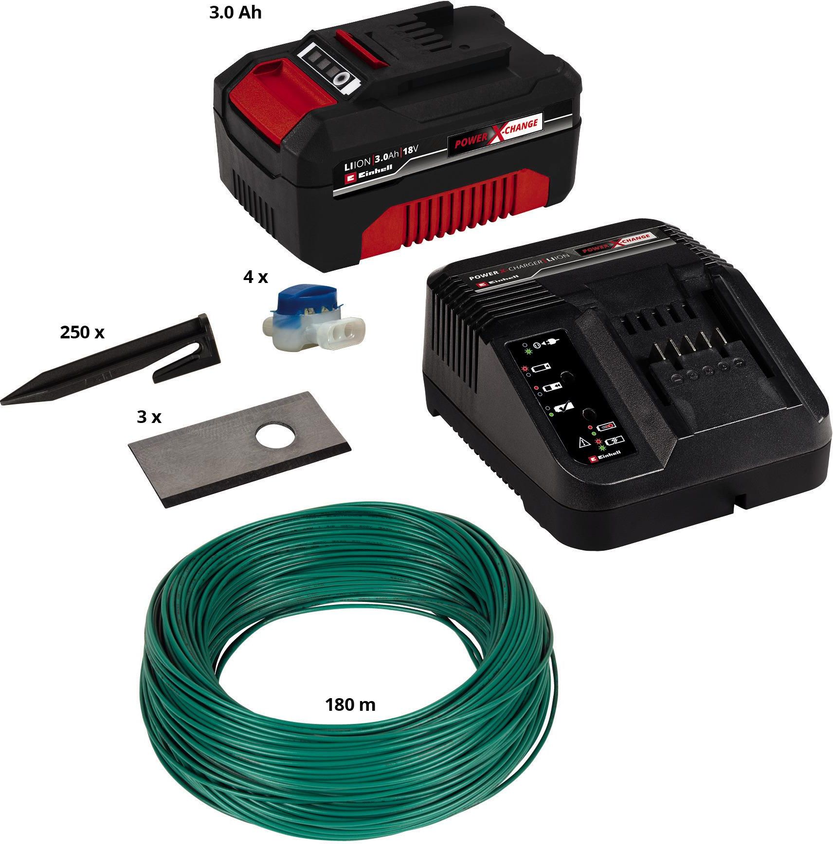 Zestaw instalacyjny przeznaczony jest to wszystkich modeli robotów koszących FREELEXO marki Einhell opartych na innowacyjnym systemie akumulatorów Power X-Change. Dołączony akumulator ma pojemność 3,0Ah oraz szybkoładującą ładowarkę 3A. W zestawie znajduje się przewód ograniczający o długości 180m, 250szt haków mocujących, 3szt ostrzy tnących oraz 4 złączki przewodu. Zestaw jest dedykowany do trawników o powierzchni do 800m2.