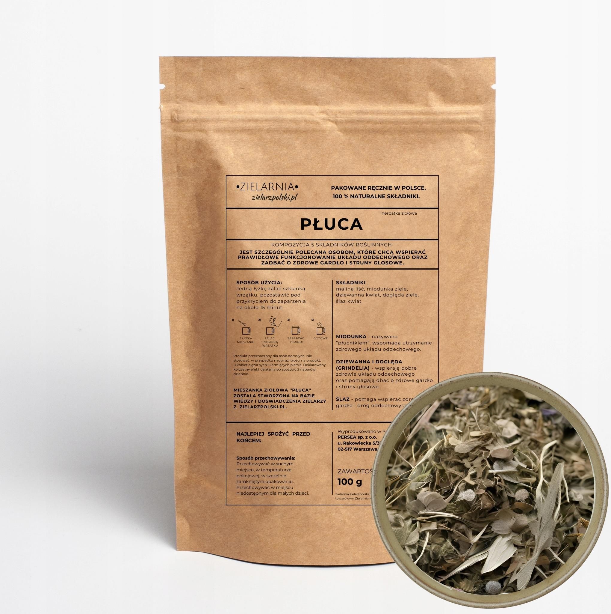 PŁUCA herbatka ziołowa 100 g ZIOŁOWA MIESZANKA "PŁUCA" jest szczególnie polecana osobom, które chcą wspierać prawidłowe funkcjonowanie układu oddechowego oraz zadbać o zdrowe gardło i struny głosowe. MIODUNKA - nazywana “płucnikiem”, wspomaga utrzymanie zdrowego układu oddechowego. DZIEWANNA I DOGLĘDA (GRINDELIA) - wspierają dobre zdrowie układu oddechowego oraz pomagają dbać o zdrowe gardło i struny głosowe. ŚLAZ - pomaga wspierać zdrowie gardła i dróg oddechowych. Mieszanka ziołowa PŁUCA została stworzona na bazie wiedzy i doświadczenia fitoterapeutów - zielarzy z Zielarnia zielarzpolski.pl. Zioła i mieszanki ziołowe od Zielarnia zielarzpolski to: Produkt 100 % naturalny. Składniki wysokiej jakości. Pakowany ręcznie w Polsce. Praktyczne i bezpieczne opakowanie z wielokrotnym zamknięciem strunowym. Ekonomiczne opakowanie - wystarcza na 50 herbat. SPOSÓB UŻYCIA Jedną łyżeczkę zalać szklanką wrzątku pozostawić pod przykryciem do zaparzenia na około 10-15 minut. SKŁADNIKI liść maliny, ziele miodunki, kwiat dziewanny, doględa, kwiat ślazu PYTANIA I ODPOWIEDZI Czy wszystkie składniki w herbatkach są naturalne? Tak, wszystkie nasze herbatki są tworzone wyłącznie z naturalnych składników. Nie używamy żadnych barwników, konserwantów ani aromatów. Jak najlepiej przechowywać herbatki, aby zachowały świeżość? Dzięki zastosowaniu w naszych herbatkach specjalnych opakowań typu doypack z wielokrotnym zamknięcie strunowym, nie musisz mieć specjalnego pojemnika, aby zioła zostały w 100% wartościowe. Pamiętaj tylko, aby opakowanie trzymać w suchym i chłodnym miejscu, z dala od bezpośredniego światła słonecznego. Czy mogę pić więcej niż jedną mieszankę ziołową dziennie? Tak, możesz łączyć różne herbatki ziołowe, jednak pamiętaj o zachowaniu odpowiedniego odstępu między nimi. Nasze organizmy są różne, a zioła mają mocne działanie. Zalecamy rozpoczęcie od jednej herbatki, aby obserwować, jak organizm na nią reaguje. Jak długo muszę czekać na efekty? Działanie ziół jest procesem, który wymaga czasu. Niektóre osoby mogą zauważyć poprawę samopoczucia już po kilku dniach regularnego picia herbatki, jednak dla pełnych efektów zalecamy kurację trwającą co najmniej 3-4 tygodnie. Maksymalny czas, który rekomendujemy pić jedną i tę samą mieszankę to 3 miesiące. Jak długo mogę przechowywać herbatkę po otwarciu opakowania? Herbatki ziołowe, przechowywane w odpowiednich warunkach, zachowują swoje właściwości aż do upłynięcia daty ważności podanej na opakowaniu. Ważne, aby po każdym użyciu szczelnie zamykać opakowanie, aby zachować świeżość i aromat ziół. Czy herbatki mogą być stosowane przez kobiety w ciąży? Rekomendujemy, aby kobiety w ciąży oraz osoby cierpiące na różne schorzenia konsultowały spożywanie ziół z lekarzem, farmaceutą lub specjalistą. Zioła mogą mieć silne działanie, dlatego bezpieczeństwo i zdrowie naszych klientów jest dla nas priorytetem. Czy mogę pić herbatkę ziołową na zimno? Tak, wiele naszych herbat ziołowych może być spożywanych zarówno na ciepło, jak i na zimno. Napar po ostygnięciu można przechowywać w lodówce i pić jako orzeźwiający napój. To doskonały sposób na nawodnienie organizmu i cieszenie się korzyściami zdrowotnymi ziół w upalne dni. Czy herbatki ziołowe mogą interakcji z lekami, które przyjmuję? Tak, niektóre zioła mogą wchodzić w interakcje z lekami na receptę, suplementami diety lub innymi ziołowymi produktami. Zalecamy konsultację z lekarzem, farmaceutą lub specjalistą. Czy herbatki ziołowe są bezpieczne do picia codziennie? Tak, większość herbat ziołowych jest bezpieczna do codziennego spożycia, o ile przestrzega się zalecanych dawek. Ważne jest jednak, aby słuchać swojego ciała i obserwować, jak reaguje na dane zioła, szczególnie w przypadku długoterminowego stosowania. Produkt przeznaczony dla osób dorosłych. Nie stosować: w przypadku nadwrażliwości na produkt, u kobiet ciężarnych i kobiet karmiących. Osoby zażywające leki lub osoby chore powinny przed użyciem skontaktować się z lekarzem. ZAWARTOŚĆ NETTO: 100 g Sposób przechowywania Przechowywać w suchym miejscu, w temperaturze pokojowej w szczelnie zamkniętym opakowaniu. Przechowywać w miejscu niedostępnym dla małych dzieci. Zdjęcia ziół mogą być zdjęciami symbolicznymi lub propozycją podania. Informację o ziołach nie stanowią porady medycznej. Wyprodukowano w Polsce dla PERSEA SP. Z O.O. Rakowiecka 5/37, 02-517 Warszawa