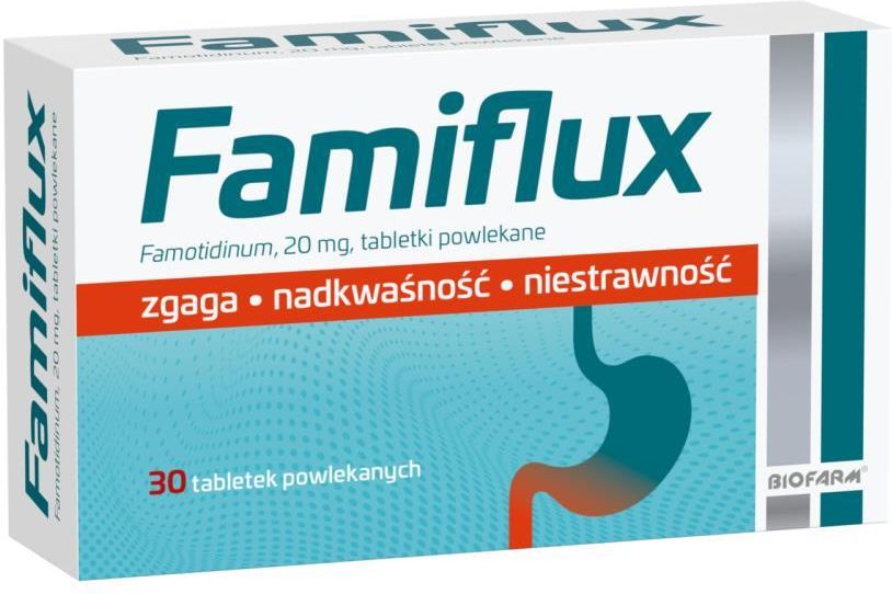 Famiflux 20 mg tabletki powlekane, 30 sztuk Famotidinum Ulotka dla pacjenta Należy uważnie zapoznać się z treścią ulotki przed zastosowaniem leku, ponieważ zawiera ona informacje ważne dla pacjenta. Lek ten należy zawsze stosować dokładnie tak, jak to opisano w tej ulotce dla pacjenta, lub według zaleceń lekarza lub farmaceuty. - Należy zachować tę ulotkę, aby w razie potrzeby móc ją ponownie przeczytać. - Jeśli potrzebna jest rada lub dodatkowa informacja, należy zwrócić się do farmaceuty. - Jeśli u pacjenta wystąpią jakiekolwiek objawy niepożądane, w tym wszelkie objawy niepożądane niewymienione w tej ulotce, należy powiedzieć o tym lekarzowi lub farmaceucie. Patrz punkt 4. - Jeśli po upływie 14 dni nie nastąpiła poprawa lub pacjent czuje się gorzej, należy skontaktować się z lekarzem. 1. Co to jest lek Famiflux w jakim celu się go stosuje Famiflux zawiera famotydynę, która należy do grupy leków nazywanych antagonistami receptora H2. Hamuje ona wydzielanie kwasu solnego w żołądku. Wskazaniem do stosowania leku jest krótkotrwałe objawowe leczenie u dorosłych dolegliwości żołądkowych niezwiązanych z chorobą organiczną przewodu pokarmowego, takich jak: niestrawność (dyspepsja), zgaga, nadkwaśność. Działanie leku utrzymuje się przez 10 do 12 godzin. 2. Informacje ważne przed zastosowaniem leku Famiflux Kiedy nie przyjmować leku Famiflux - jeśli pacjent ma uczulenie na famotydynę lub którykolwiek z pozostałych składników tego leku (wymienionych w punkcie 6); - jeśli pacjent ma uczulenie na inne leki z grupy antagonistów receptorów H2 w wywiadzie; - jeśli u pacjenta występuje niewydolność nerek. Ostrzeżenia i środki ostrożności Przed rozpoczęciem przyjmowania leku Famiflux należy omówić to z lekarzem lub farmaceutą: - jeśli u pacjenta występują zaburzenia czynności nerek. Lek Famiflux może maskować objawy innych chorób, w tym raka żołądka. Z tego względu, w przypadku wystąpienia któregokolwiek z poniższych stanów przed rozpoczęciem lub w trakcie przyjmowania leku należy niezwłocznie skontaktować się z lekarzem: - nawracające wymioty, - pojawienie się wymiotów z treścią pokarmową lub krwią, - oddawanie czarnych stolców (kału podbarwionego krwią), - jeśli u pacjenta wraz z niestrawnością występuje chudnięcie, trudności w połykaniu lub utrzymujące się bóle brzucha, - jeśli u pacjenta dotychczas nie występowały dolegliwości żołądkowe (dyspeptyczne) lub występowały, ale ostatnio zmieniły się - szczególnie dotyczy to osób w średnim lub podeszłym wieku. Jeśli dolegliwości nie ustąpią po 14 dniach leczenia należy bezzwłocznie skontaktować się z lekarzem celem zweryfikowania diagnozy. Dzieci i młodzież Bezpieczeństwo i skuteczność stosowania leku u dzieci dotychczas nie zostały ustalone. Leku nie należy stosować u dzieci i młodzieży. Famiflux a inne leki Należy powiedzieć lekarzowi lub farmaceucie o wszystkich lekach przyjmowanych przez pacjenta obecnie lub ostatnio, a także o lekach, które pacjent planuje stosować. - Famotydyna nie wchodzi w interakcje z warfaryną (lek zmniejszający krzepliwość krwi), teofiliną (lek stosowany w leczeniu astmy i innych schorzeń układu oddechowego), fenytoiną (lek przeciwpadaczkowy), diazepamem (lek przeciwlękowy i uspokajający), propranololem (lek nasercowy), aminofenazonem, fenazonem (leki przeciwbólowe). - Zmiany pH treści żołądkowej mogą wpływać na biodostępność niektórych leków (np. zmniejszeniem wchłaniania atazanawiru (lek przeciwwirusowy stosowany w leczeniu zakażenia wirusem HIV)). - Famotydyna może zmniejszać wchłanianie ketokonazolu i itrakonazolu (leki przeciwgrzybicze). Ketokonazol należy podawać na dwie godziny przed podaniem famotydyny. - Leki zobojętniające kwas solny w żołądku mogą zmniejszać wchłanianie famotydyny i prowadzić do obniżenia stężenia famotydyny w surowicy. Dlatego famotydynę należy przyjmować na 1-2 godziny przed podaniem leków zobojętniających kwas solny w żołądku. - Podanie probenecydu (lek stosowany w dnie moczanowej) może opóźnić wydalanie famotydyny. Należy unikać jednoczesnego podawania famotydyny i probenecydu. - Należy unikać jednoczesnego podawania sukralfatu (lek osłonowy stosowany w leczeniu choroby wrzodowej) w ciągu dwóch godzin po podaniu famotydyny. - Istnieje ryzyko utraty skuteczności węglanu wapnia, stosowanego u pacjentów dializowanych jako lek zmniejszający nadmiernie wysokie stężenie fosforanów we krwi (hiperfosfatemia), jeśli podaje się go jednocześnie z famotydyną. - Stosowanie leku Famiflux może zmniejszyć działanie pozakonazolu w postaci zawiesiny doustnej (lek do picia stosowany w zapobieganiu i leczeniu niektórych zakażeń grzybiczych). - Stosowanie leku Famiflux może zmniejszyć działanie dazatynibu, erlotynibu, gefitynibu, pazopanibu (leki stosowane w leczeniu nowotworów). - Famotydyna może zmniejszać wchłanianie następujących związków: - Rylpiwiryna (lek stosowany w leczeniu zakażenia wirusem HIV), - cyjanokobalamina (witamina B12) (lek stosowany w niedokrwistości), - większość inhibitorów kinazy tyrozynowej (z wyjątkiem wandetanibu, imatynibu) (stosowanych w leczeniu nowotworów). Ciąża i karmienie piersią Jeśli pacjentka jest w ciąży lub karmi piersią, przypuszcza, że może być w ciąży lub gdy planuje mieć dziecko, powinna poradzić się lekarza lub farmaceuty przed zastosowaniem tego leku. Ciąża Lek Famiflux może być stosowany u kobiet w ciąży tylko wtedy, kiedy zdaniem lekarza jest to bezwzględnie konieczne. Karmienie piersią Kobiety karmiące piersią powinny zaprzestać stosowania leku Famiflux lub karmienia piersią, gdyż famotydyna przenika do mleka kobiecego. Stosowanie leku z jedzeniem i piciem Lek można stosować niezależnie od posiłków. Prowadzenie pojazdów i obsługiwanie maszyn Brak danych na temat przeciwwsk