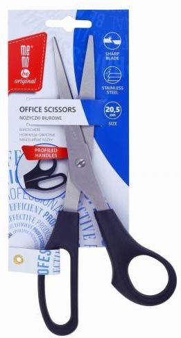 Nożyczki MemoBe z trwałym ostrzem ze stali nierdzewnej satynowanej. Produkt posiada profilowane uchwyty z trwałego tworzywa w kolorze czarnym. Charakteryzują się wytrzymałością i wygodą użytkowania oraz elegancją. Pakowane w opakowania typu TRY-ME z zawieszką. Kolor uchwytu: odcienie czarnego Materiał ostrza: stal nierdzewna Materiał uchwytu: tworzywo sztuczne Rozmiar nożyczek: 20,5 cm