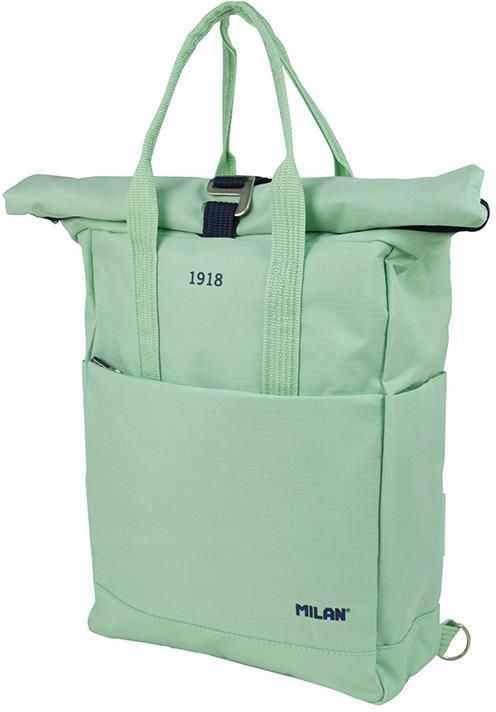 Plecak zwijany 10l MILAN 1918 zielony Stylowy plecak miejski, minimalistyczny i funkcjonalny z kolekcji 1918 w kolorze zielonym, gładki. Może służyć zarówno jako plecak lub torba po schowaniu szelek. Sprawdzi się świetnie zarówno jako towarzysz do pracy, jak i do szkoły lub na uczelnię. Zapinany i zwijany od góry plecak, który pozwala dostosować jego pojemność do zawartości. Główne cechy plecaka Górne zapięcie na suwak i regulowany pasek z metalową sprzączką. Przednia kieszeń zapinana na zamek. 2 łatwo dostępne kieszenie boczne. Wyściełana tylna kieszeń z aksamitną podszewką, która chroni ekrany i zawartość przed ewentualnym uszkodzeniem. Regulowane uchwyty, które można schować w tylnej komorze, zamieniając plecak w torbę. Granatowa podszewka wewnętrzna z nadrukowaną siatką przywołującą kształt gumek MILAN. Kolekcja 1918 jest inspirowana oryginalnymi kolorami i wzornictwem gumek MILAN. Tkanina zewnętrzna „Ripstop”: lekka i odporna na rozdarcia. Wykorzystuje specjalną technikę, która tka grube, wzmacniane nici w regularnych odstępach, tworząc wzór krzyżowy. Materiał zewnętrzny i wewnętrzny 100% poliester. Rozmiar: 42 x 29 x 11 cm. Pojemność: 10 litrów.