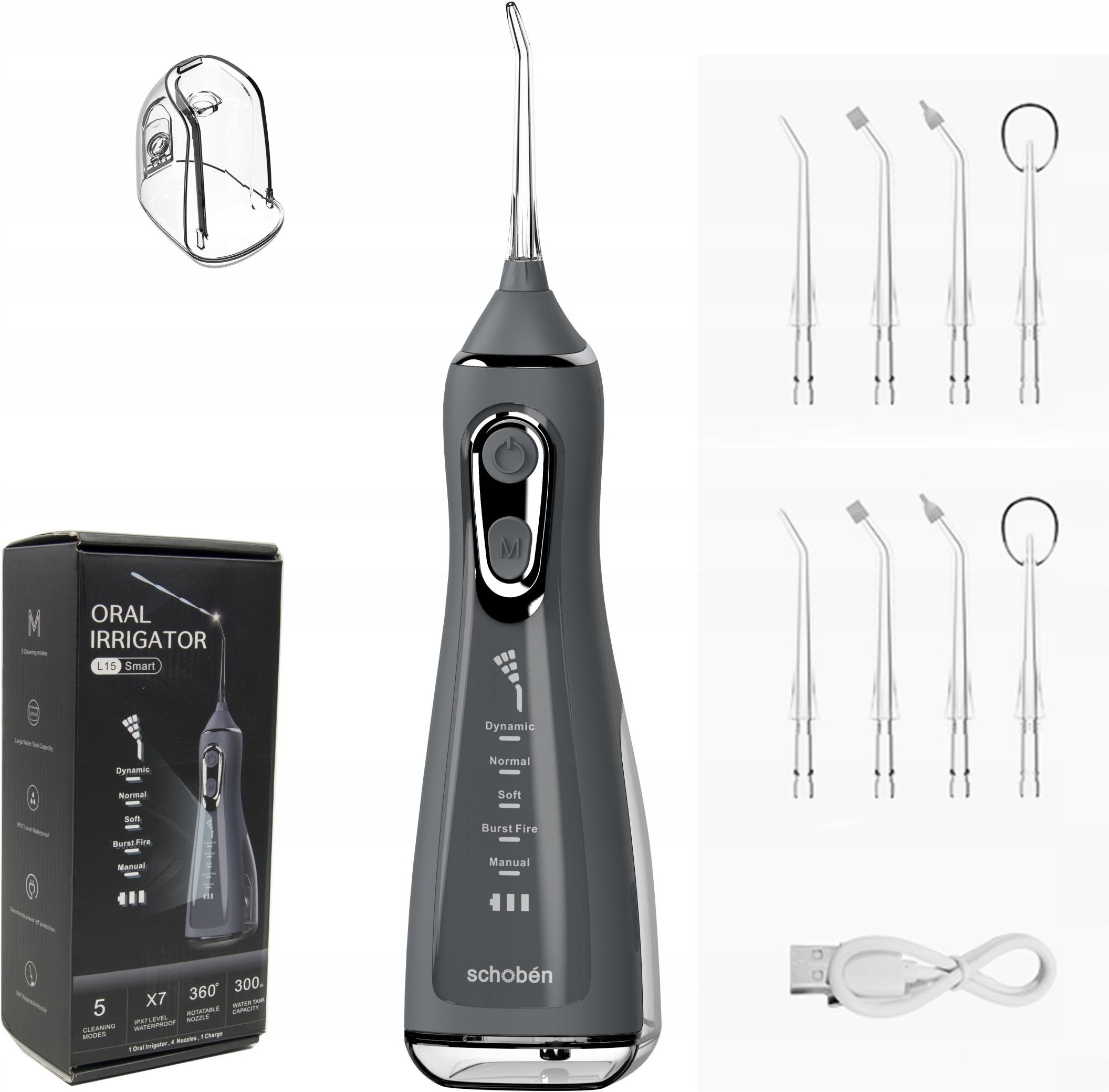 PREZENTUJEMY WYSOKIEJ JAKOŚCI BEZPRZEWODOWY IRYGATOR DENTYSTYCZNY DO HIGIENY JAMY USTNEJ Z 8 KOŃCÓWKAMI W ZESTAWIE ORAZ 5 TRYBAMI DZIAŁANIA Irygator który pozwoli zadbać Ci o higienę jamy ustnej. Zdrowy i piękny uśmiech z irygatorem 5 skutecznych trybów pracy 8x wymienne dysze Duży zbiornik na wodę 300ml Pojemny akumulator Wodoodporny Kabel USB do ładowania Unikalny kształt dla Twojej wygody Samo mycie zębów i stosowanie nici dentystycznej nie wystarcza aby mieć świeży oddech i zdrowe zęby. Na pewno wielokrotnie zastanawiałeś się, czy wydobywa się z twoich ust nieprzyjemny zapach. Najczęstszym powodem nieprzyjemnego zapachu są pozostałości pokarmów gromadzące się w przestrzeni między zębowej, z którymi nie poradziła sobie szczoteczka, czy nić dentystyczna. ZBIORNIK NA WODĘ 300ML nasz IRYGATOR posiada wyjmowany zbiornik na wodę o pojemności aż 300ml Zbiornik na wodę o dużej pojemności 300 ml wystarcza na około 80 sekund przepływu wody, co pozwala przejść całą procedurę czyszczenia jamy ustnej bez konieczności wielokrotnego uzupełniania wody. Zdejmowana konstrukcja ułatwia mycie zbiornika co sprawia, że irygator można łatwo utrzymać w czystości. Kulka grawitacyjna będzie zawsze tam gdzie woda dzięki temu masz ciągłość pracy w dowolnej pozycji urządzenia! 5 TRYBÓW PRACY DYNAMICZNY NORMALNY DELIKATNY BURST FIRE MANUALNY Do czyszczenia przestrzeni między zębowej idealnie nadaje się nasz irygator L15, dzięki któremu nie podrażnisz dziąseł, tak jak ma to miejsce w przypadku używania szczoteczki między zębowej. W połączeniu ze szczoteczką do mycia zębów raz na zawsze pozbawi cię przykrego zapachu z ust wynikającego z gromadzonego pokarmu w miejscach trudno dostępnych. Irygator świetnie sprawdzi się u każdego, nawet u dzieci, jednak jest szczególnie polecany dla osób z: krwawiącymi dziąsłami ciasnymi przestrzeniami międzyzębowymi implantami i mostami aparatami ortodontycznymi 8 WYMIENNYCH DYSZ DYSZA WYSOKOCIŚNIENIOWA (2 sztuki) - Odpowiednia do codziennego czyszczenia DYSZA ORTODONTYCZNA (2 sztuka) - Specjalna końcówka dla osób posiadających aparat ortodontyczny lub implant stomatologiczny DYSZA DO CZYSZCZENIA NOSA (2 sztuka) - Końcówka przeznaczona do oczyszczania / udrażniania nosa DYSZA DO CZYSZCZENIA JĘZYKA (2 sztuka) - Nadaje się do czyszczenia języka SPECYFIKACJA PRODUKTU 1. Dysza (końcówka) 2. Obrotowa głowica 360° 3. Przycisk zasilający 4. Przycisk wyboru trybu pracy 5. Wskaźnik trybu pracy 6. Port ładowania irygatora (w zestawie z zatyczką gumową) 7. Duży, szczelny, otwierany zbiornik na wodę 300ml 8. Przycisk zwalniający dyszę