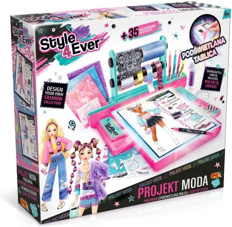 Zestaw kreatywny Projekt Moda z podświetlaną tablicą Projekt Moda - Pracownia z podświetlaną tablicą Zaprojektuj własną kolekcję Projekt Moda to kreatywne zestawy, które pozwalają dzieciom projektować własne stylizacje inspirowane sztuką, filmem, naturą i codziennym życiem. Zbieraj pomysły podczas spaceru, wycieczki czy zakupów - wszystko, co Cię inspiruje, może stać się początkiem niezwykłego projektu. Potem przekształć swoje notatki w wyjątkowe szkice, ozdób i zaprezentuj światu. Pomoże Ci w tym doskonale wyposażona pracownia z podświetlaną tablicą i miejscem do przechowywania wszystkich akcesoriów. Jak korzystać z podświetlanej tablicy? Włącz podświetlenie. Umieść na tablicy wybrane szablony elektrostatyczne. Następnie, połóż na nie papierowy arkusz z modelką i zacznij odrysowywać. Dodaj całości koloru i twórz wyjątkowe detale za pomocą różnych materiałów, ozdób i akcesoriów. Twórz jak prawdziwy projektant Zaprojektuj kompletną kolekcję - na weekend, do szkoły, czy na wakacje Wybierz swój styl: odważne kolory, ciekawe faktury, wzory i detale Zainspiruj się wszystkim, co Cię otacza - nawet wizyta w zoo może przerodzić się w kolekcję z motywem zwierzęcym! Dlaczego warto? Rozwija kreatywność, wyobraźnię i zmysł estetyczny Pozwala poczuć się dziecku, jak prawdziwy projektant mody Jedyna linia na rynku, która została wzbogacona o prawdziwe, samoprzylepne tkaniny Idealna dla dzieci 6+, kochających rysunek, modę i DIY