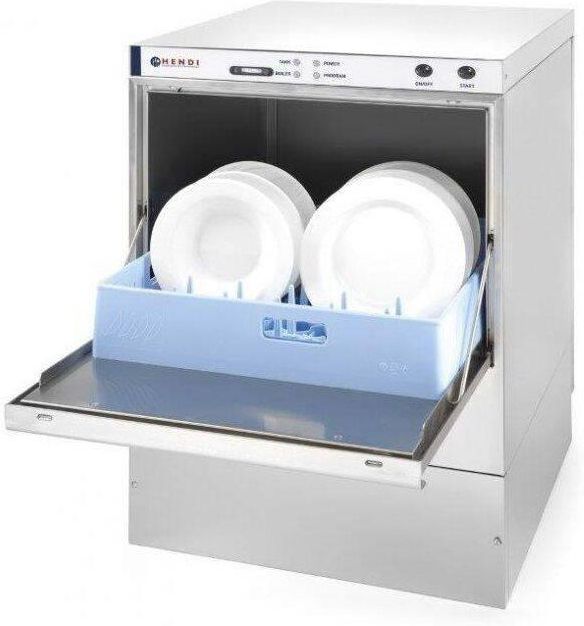 Profesjonalna zmywarka gastronomiczna do naczyń 50x50. Idealna do mycia kubków, filiżanek, szkła, sztućców, talerzy. Sterowanie jest elektromechaniczne. Obudowa zrobiona ze stali nierdzewnej AISI 304. Ramiona są oddzielne myjące i płuczące, ze stali nierdzewnej. Nóżki regulowane. Cykl mycia z płukaniem trwa około 120 s. Mycie naczyń odbywa się w temperaturze około 62ºC, natomiast płukanie – w temperaturze około 85ºC. Wydajność do 30 koszy na godzinę. W wyposażeniu zmywarki Hendi znajdują się: 3 kosze: uniwersalny na szkło 50x50 cm, z bolcami na talerzyki 50x50 cm oraz koszyczek na sztućce 11x11x13 cm Uwaga: Mycie w zmywarce gastronomicznej może się odbywać wyłącznie przy użyciu profesjonalnych środków chemicznych przeznaczonych do zmywarek przemysłowych. Odpływ wody ze zmywarki standardowo odbywa się grawitacyjnie. W przypadku odpływu ściekowego w pomieszczeniu zamontowanego powyżej podłogi zmywarkę należy umieścić na podstawie. Podwyższoną jakość mycia oraz ochronę przed osadzaniem się kamienia zapewni zamontowanie uzdatniacza wody.