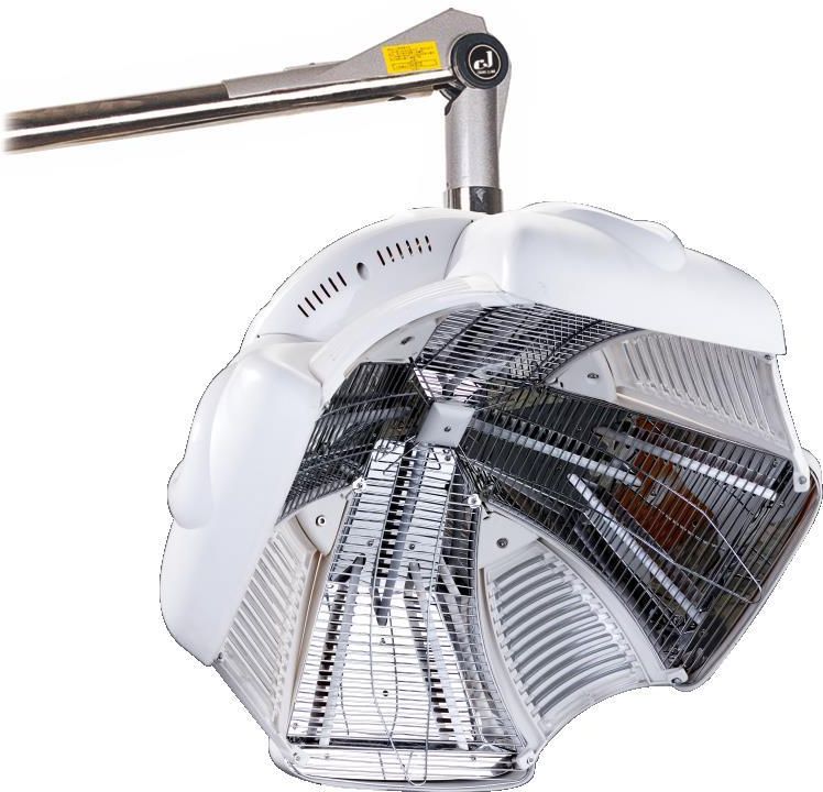 Infrazony to wielofunkcyjne urządzenia. Promienie cieplne nie tylko stanowią źródło grzania, ale również pobudzają ruch cząsteczek. W oparciu o technologię infrazon przyspiesza proces wchłaniania aktywnych składników oraz farb we włosy. Promieniowanie cieplne emitowane jest z pól grzewczych, które w czasie zabiegu znajdują się wokół głowy klienta. Niektóre modele posiadają pojedynczo włączane lampy, dlatego też istnieje możliwość nagrzewania nie tylko całej powierzchni, lecz także poszczególnych partii włosów, w zależności od wykonywanego zabiegu. Głównym elementem infrazonu jest swego rodzaju kopuła, który otacza głowę osoby poddającej się zabiegowi. Infrazon można swobodnie obracać i dopasowywać do indywidualnej pozycji każdego klienta. Przydatną funkcją jest również wbudowany timer, który pozwoli precyzyjnie ustawić czas trwania zabiegu. Urządzenie może pomóc również rozwiązać problemy z włosami, takie jak łupież, intensywne przetłuszczanie czy problemy z ich rozczesywaniem. Infrazon to urządzenie, które przyda się w każdym salonie fryzjerskim. Znacząco przyspiesza zabiegi chemiczne i pielęgnacyjne wykonywane na włosach klientów. Pozwala to na przyjęcie jeszcze większej liczby klientów przy zachowaniu wysokiej jakości świadczonych usług. To urządzenie niezbędne również do rozjaśniania, farbowania, a także stylizacji oraz innych kuracji którym towarzyszy wysoka temperatura. Wizyta w salonie fryzjerskim to dla wielu klientów czas relaksu i czas poświęcenia uwagi własnej osobie. Ta chwila nie byłaby możliwa bez profesjonalnego sprzętu jakim jest właśnie infrazon. Urządzenie sprawi, że po dokonanym zabiegu klienci poczują się piękniejsi oraz pewniejsi siebie. Posiadanie infrazonu w swoim salonie oszczędza czas zarówno klientów, jak i fryzjerów. Z jego pomocą możesz poszerzyć swoją ofertę o zaawansowane kuracje odżywcze oraz lecznicze. Urządzenie dzięki możliwości regulacji temperatury zapewnia skuteczność i bezpieczeństwo zabiegów, gdyż w czasie różnorodnych kuracji temperatura powinna być różna. Infrazon przyśpieszyć również może dekoloryzację. Podany model wyróżnia się następującymi cechami: Model wiszący zajmujący mniej miejsca w salonie Model z dwunastoma lampami grzewczymi Możliwość włączania/wyłączania poszczególnych lamp wraz z nawiewem Funkcja nawiewu z regulacją czterostopniową Czterostopniowa płynna regulacja temperatury Sześć programów zdefiniowanych Skraca czas wykonywania zabiegów Wspiera pielęgnację, farbowanie, ondulację oraz wszelkie zabiegi termiczne włosów Zapewnia wysoką wchłanialność produktów pielęgnacyjnych Wygodne i łatwe w obsłudze sterowanie elektroniczne Urządzenie wysyła sygnał dźwiękowy po zakończeniu pracy wybranego programu Timer 0-60 minut Moc 1800 W
