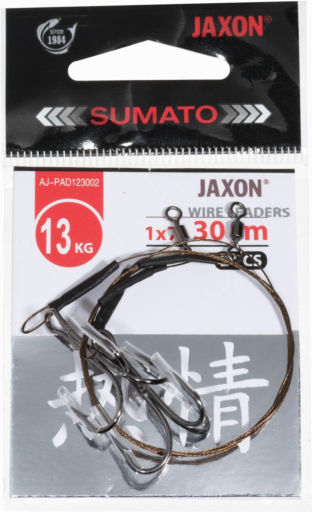 Jaxon Przypon Żywcowy Sumato 30cm 13kg Kotwica 04 Gotowe przypony do zastosowania w połowach na żywca lub martwą rybkę. Przypony zostały wykonane ze splotu 7 mikrowłókien stalowych i uzbrojone są w klasyczną kotwicę. długość - 30 cm roziar kotwicy 03 waga - 13 kg opakowanie - 2 szt.