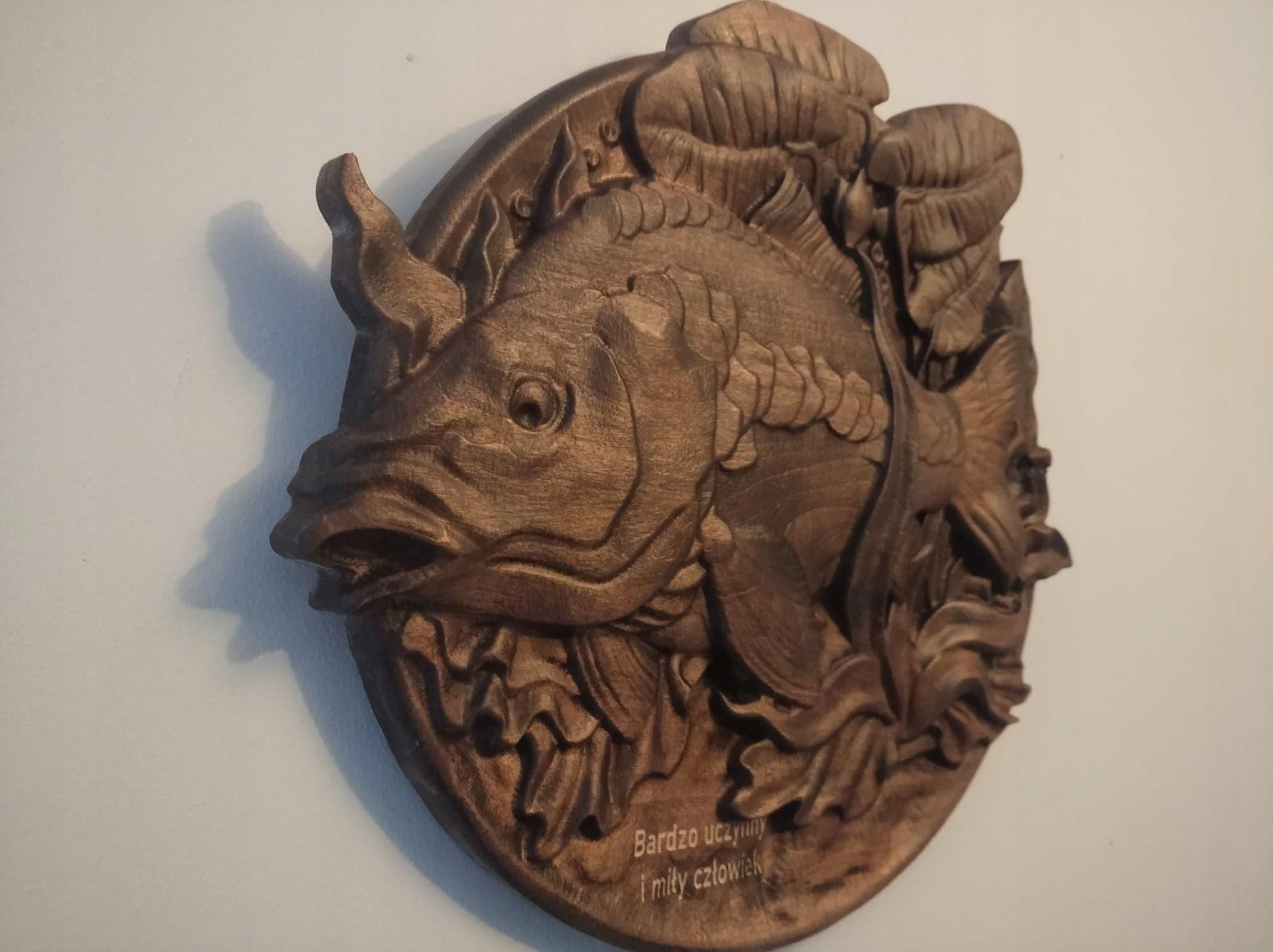 płaskorzeźba drewno karp wędkarstwo obraz Imielin