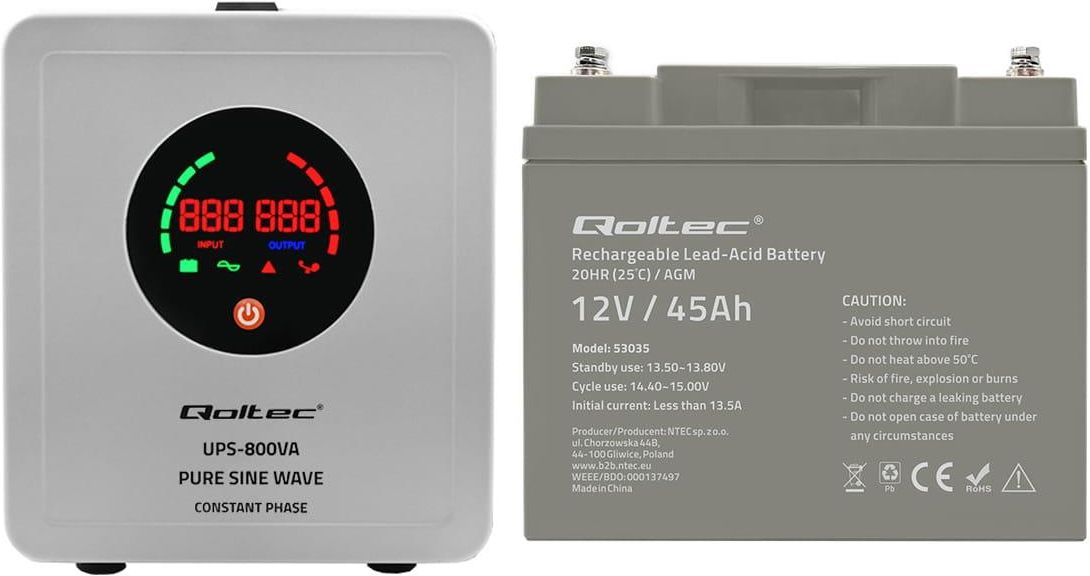 Zestaw: zasilacz awaryjny Qoltec Pure Sine Wave UPS 800VA/560W + akumulator Qoltec AGM LongLife 12V 45Ah Imielin