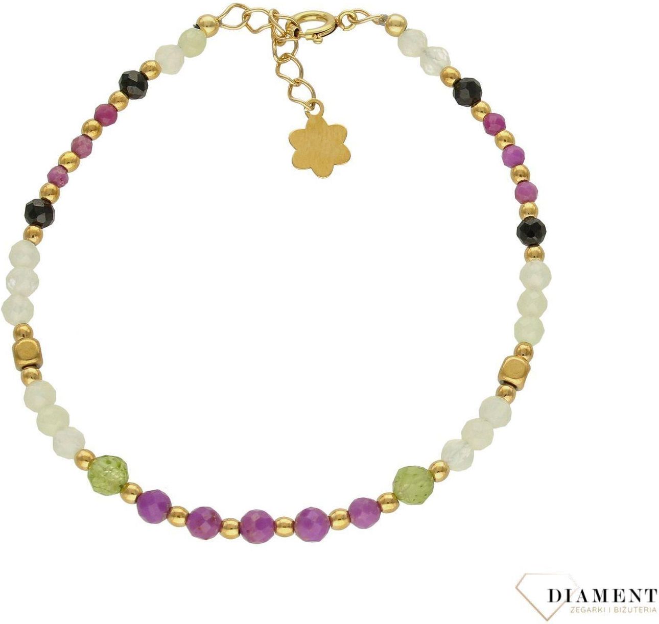 Bransoletka damska z kamieniami naturalnymi. Urocza bransoletka składająca się z drobnych kamieni naturalnych. Zastosowane kamienie w odcieniach bieli, różu i zieleni oprócz pięknego wyglądu posiadają szereg właściwości. Bransoletki z kamieniami naturalnymi od lat zachwycają elegancją i ponadczasowym pięknem. Bransoletka to niezwykle wyjątkowy i nietuzinkowy dodatek, który doskonale sprawdzi się w stylizacjach zarówno wieczorowych, jak i na co dzień. Długość bransoletki wynosi wynosi 17 cm i można ją przedłużyć o kolejne 2 cm. Bransoletka posiada wygodne zapięcie na karabińczyk ze srebra próby 925 w złotym kolorze. Waga 2,60 g Jadeit, święty kamień władzy, długowieczności, płodności, mądrości i równowagi. Oliwin pomaga nam w odstresowaniu się, pozbyciu złych emocji, ukojeniu nerwów oraz w uzyskaniu harmonii. > Biżuteria z kamieniami naturalnymi Zerknij na pozostałą ofertę! > Bransoletki damskie > Kolczyki srebrne > Pierścionki srebrne > Naszyjniki srebrne Nasz sklep internetowy ze złotą i srebrną biżuterią Diament jest autoryzowanym dystrybutorem marki. Cała kolekcja złotej i srebrnej biżuterii Diament zakupiona w naszym sklepie posiadają 2 letnią gwarancję i zapakowane są w oryginalne opakowanie.