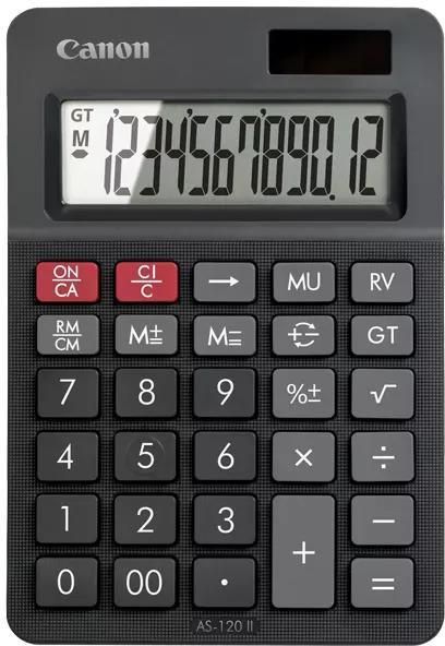 AS-120 is a desktop calculator with 12-digit upright angled display, mark-up and reverse function. Some parts of it are manufactured from Canon recycle material for maximum resource efficiency. At least 20% recycled plastic.