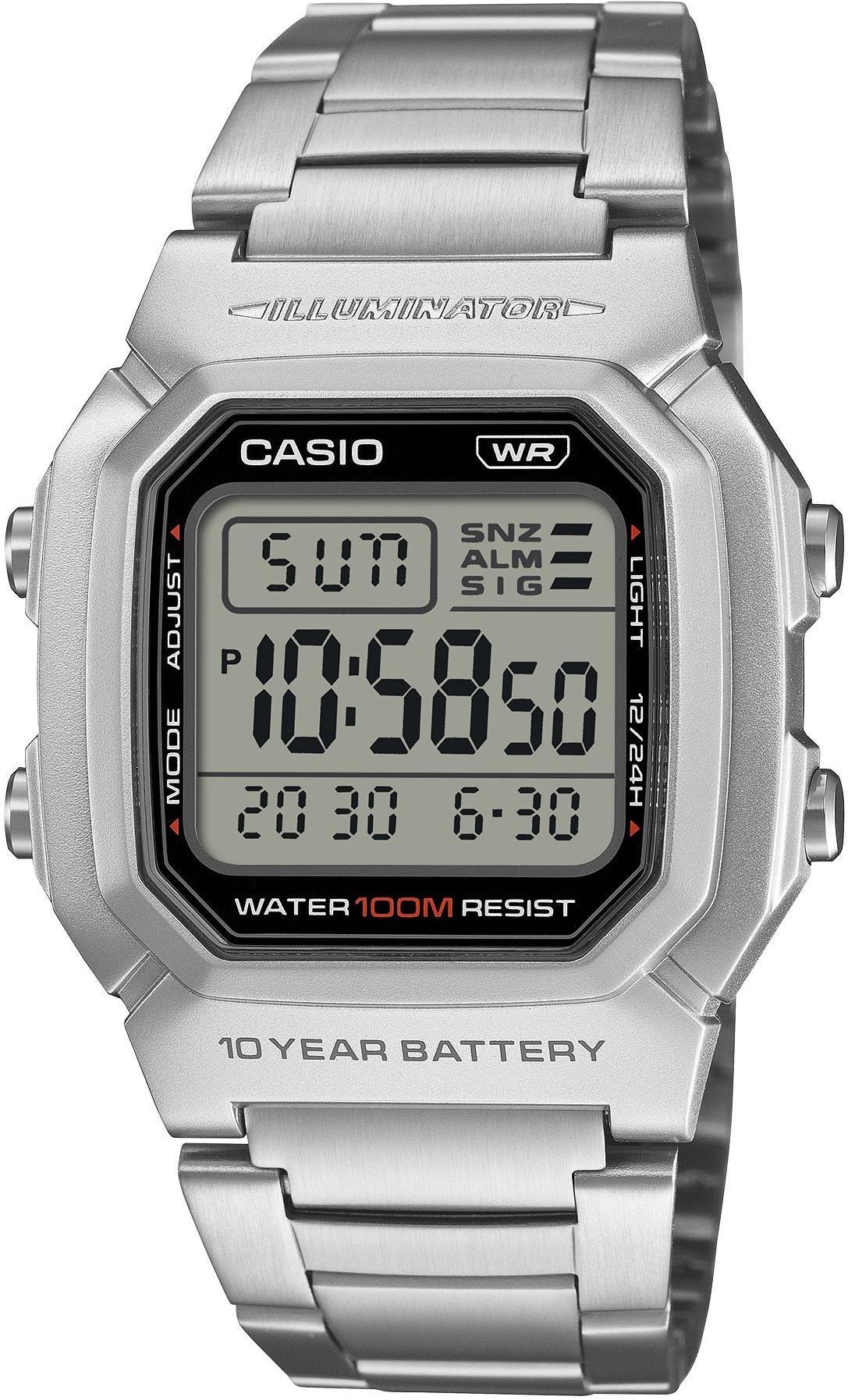 SPRAWDŹ WIĘCEJ NOWOŚCI G-SHOCK Odkryj CASIO W-800HD -1AVEF CASIO W-800HD -1AVEF to klasyczny zegarek męski cyfrowy, który łączy kultowy design marki Casio z praktycznymi funkcjami do codziennego użytkowania. Model z serii CASIO TIMELESS COLLECTION MEN to doskonały wybór dla osób ceniących prostotę, funkcjonalność i ponadczasowy styl. Srebrna koperta oraz stalowa bransoleta nadają zegarkowi uniwersalny, sportowo-klasyczny charakter, który sprawdzi się zarówno na co dzień, jak i podczas aktywności. Tarcza i szkło Zegarek wyposażony jest w czytelny, cyfrowy wyświetlacz, umożliwiający szybki odczyt godziny oraz wszystkich funkcji dodatkowych. Podświetlenie zapewnia wygodne korzystanie z zegarka także po zmroku. Wyświetlacz chroniony jest przez szkło akrylowe, lekkie i odporne na pęknięcia, idealne do codziennego użytkowania. Mechanizm Wewnątrz zegarka pracuje precyzyjny mechanizm kwarcowy, gwarantujący niezawodność i dokładność pomiaru czasu. Zegarek wyposażono w przydatne funkcje, takie jak alarm, stoper, timer, datownik oraz system podświetlenia, który ułatwia odczyt w każdych warunkach — także po zmroku. Koperta i bransoleta Koperta o szerokości 36 mm, wykonana z wytrzymałego tworzywa sztucznego w srebrnym kolorze, zapewnia lekkość i komfort noszenia. Stalowa bransoleta dodaje zegarkowi elegancji i trwałości, jednocześnie podkreślając klasyczny styl cyfrowych zegarków Casio.