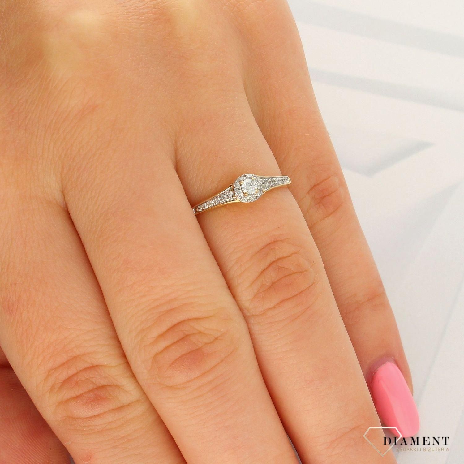 Pierścionek złoty DIAMENT żółte złoto, diamenty, zaręczynowy. Pierścionek wykonany ze złota próby 585. Pierścionek z dwudziestoma dwoma brylantami o łącznej wielkości 0,12 ct, barwie H oraz czystości SI2. Piękny pierścionek ozdobiony brylantami o okrągłym kształcie, otulony złotem. Klasyka w …