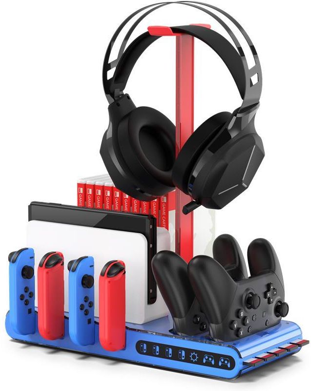 Wielofunkcyjna podstawka DLX do konsoli Switch/Switch OLED Stylowy design kompatybilny zarówno z oryginalną, jak i OLED-ową wersją konsoli Switch Ten zajmujący niewiele miejsca, wielofunkcyjny stojak zasilany zasilaczem sieciowym Switch (brak w zestawie) umożliwia ładowanie kontrolerów do gier i przechowywanie konsoli, gier, kontrolerów i akcesoriów. DLX2+LED zawiera również nastrojowe podświetlenie LED z wieloma kolorami i efektami tęczy. Kompatybilny z oryginalnymi konsolami Switch i OLED Switch Kieszeń do ładowania konsoli Podświetlenie LED z wieloma trybami Ładowanie do 4 kontrolerów Joy-Con ze wskaźnikami LED stanu ładowania Podwójne ładowanie ze wskaźnikiem stanu naładowania, w tym adaptery Drop 'n' Charge dla kontrolerów Pro Miejsce na maksymalnie 10 gier (zakryte) Miejsce do przechowywania do 5 kart z grami Switch Stojak na słuchawki Dwa porty USB 2.0 Inteligentny, potrójny tryb ochrony przed przeładowaniem i zwarciem Łatwa instrukcja montażu w zestawie *Wymaga zasilacza sieciowego Switch dołączonego do konsoli (brak w zestawie) do wszystkich funkcji ładowania, podświetlenia i USB.