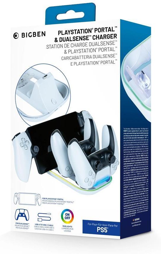Naładuj swój kontroler PlayStation Portal wraz z dwoma kontrolerami bezprzewodowymi DualSense za pomocą tej stacji ładującej od firmy Nacon. Wystarczy umieścić kontrolery na odpowiednich złączach USB-C i poczekać, aż się w pełni naładują. O aktualnym stanie naładowania informuje kolorowe podświetlenie pod każdym z kontrolerów. Stacja, którą można zasilać z konsoli PlayStation 5 za pomocą dołączonego kabla USB, jest dodatkowo ozdobiona paskiem świetlnym, w którym można wybierać spośród czternastu różnych efektów RGB za pomocą przycisku. - Za pomocą tej stacji dokującej od firmy Nacon możesz jednocześnie ładować swój PlayStation Portal oraz dwa kontrolery DualSense. - Podświetlenie pod kontrolerami informuje o stanie naładowania. - Pasek RGB oferuje 14 różnych efektów świetlnych. - W zestawie znajduje się kabel zasilający z wtyczkami USB-A i USB-C. Producent: Nacon.