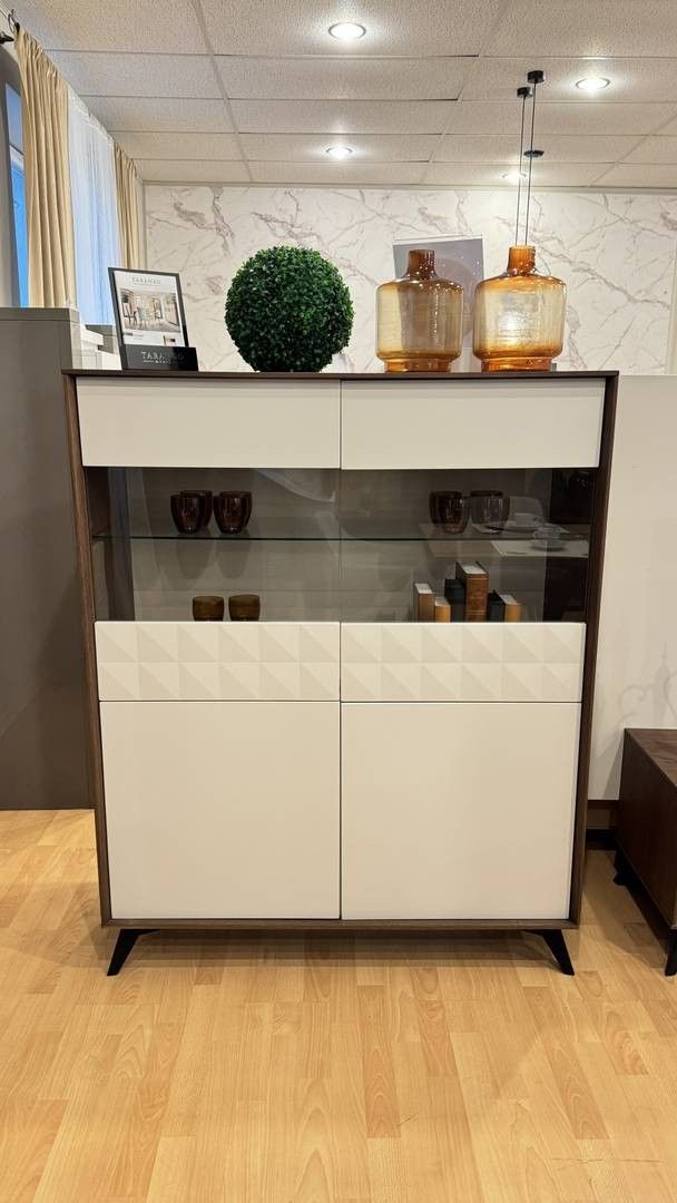 Witryna niska z barkiem od Taranko Meble to elegancki i funkcjonalny mebel, który doskonale łączy praktyczne rozwiązania z nowoczesnym designem. Dzięki swojej kompaktowej formie i atrakcyjnemu wyglądowi sprawdzi się zarówno w salonie, jak i w jadalni. Cechy produktu: Część środkowa przeszklona – idealna do ekspozycji szkła, porcelany lub dekoracji Wbudowany barek z półką na kieliszki i trunki Fronty w modnym, jasnym wykończeniu z dekoracyjnym frezowaniem Korpus w eleganckim kolorze drewna, podkreślający nowoczesny charakter kolekcji Solidna konstrukcja oparta na czarnych, smukłych nóżkach Dyskretny system otwierania push-to-open Wymiary: Szerokość: 112 cm Głębokość: 43 cm Wysokość: 140 cm Dlaczego warto: Eleganckie połączenie funkcji witryny i barku w jednym meblu Idealna do przechowywania i eksponowania alkoholi, szkła oraz dodatków Smukła forma, która nie przytłacza wnętrza Starannie dopracowane detale i wysoka jakość wykonania renomowanej marki Taranko