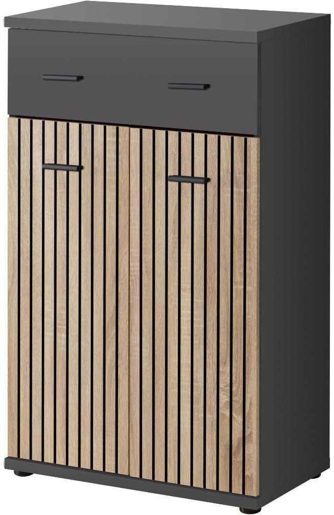 MARCO szafka Typ G - antracyt, artrisan / aplikacja: czarne paski (nadruk) Wymiary całkowite (S/W/G): 60 cm / 96 cm / 32 cm materiał: płyta meblowa laminowana szafka z szufladą i dwoma drzwiczkami, za którymi znajdują się dwie półki zwykłe nowoczesny design aplikacja: czarne paski (nadruk) nowoczesny design mebel do samodzielnego montażu w zestawie dołączona jest instrukcja montażu oraz wszystkie elementy montażowe bardzo łatwy montaż