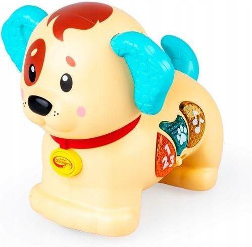 Piesek Lesio DD55015 Rozbrykany piesek czeka na wspólną zabawę! Lesio to aktywizujący słodziak, który zabawi najmłodszych piosenkami i frazami w języku polskim oraz jazdą do przodu. Zabawka posiada ruchomą głowę i zabawny, merdający ogonek. Piesek działa w dwóch trybach, a każdy z nich uruchamia się poprzez ustawienie przełącznika, umieszczonego na boku zabawki, na wybraną pozycję (OFF [kropka] – zabawka wyłączona, ON [pojedynczy trójkącik]- zabawka działa w trybie statycznym, ruch [podwójny trójkącik] – zabawka działa w trybie dynamicznym). Aby zachęcić Lesia do ruchu, po przełączeniu na tryb dynamiczny, pogłaszcz go po głowie. Poza przełącznikiem zmiany trybu, bok zwierzaka zdobią też trzy kolorowe przyciski, a każdy z nich aktywuje inne, wesołe dźwięki. 🧠 Co potrafi Piesek Lesio? 🐾 Interakcje i ruch Ruchome elementy: piesek ma ruchomą głowę i merdający ogonek, które zwiększają zainteresowanie zabawką. Jeździ do przodu: po ustawieniu przełącznika w tryb dynamiczny i pogłaskaniu po głowie Lesio ruszy z miejsca – to zachęta dla malucha do obserwacji i aktywności. 🎶 Dźwięki i piosenki Polskie frazy i piosenki: piesek mówi i śpiewa, komunikując się w języku polskim. 3 kolorowe przyciski: każdy przycisk wywołuje różne wesołe melodie lub frazy, które bawią i angażują dziecko. 📱 Tryby działania Dumel Lesio ma 3 ustawienia: OFF – zabawka wyłączona, ON – tryb statyczny (dźwięki/światła bez ruchu), Ruch – piesek porusza się i wydaje dźwięki. 🖐️ Dodatkowe funkcje sensoryczne Czujnik dotyku na głowie: zachęca do dotyku i interakcji. Świecące przyciski: dodatkowy efekt świetlny przyciąga uwagę malucha. Uchwyty o różnej fakturze: miłe detale, np. fakturowane uszka. 📅 Dane techniczne 👶 Wiek: od 12 m+ – dostosowany do rocznego i starszego dziecka. 🔋 Zasilanie: 3 × baterie AA (często są baterie testowe w zestawie). 🐾 Materiał: bezpieczny plastik, odporna konstrukcja do zabawy. Dlaczego warto? Rozwija zmysły: dźwięk, światło i ruch pobudzają słuch, wzrok i ciekawość. Uczy przez zabawę: wesołe piosenki i frazy w języku polskim pomagają osłuchać się z mową. Zachęca do ruchu: jazda do przodu skłania dziecko do obserwacji i eksperymentowania. Interakcja: sensoryczne elementy i aktywne przyciski zachęcają do eksploracji świata. 🧸 Podsumowanie Piesek Lesio to interaktywny piesek edukacyjny od Dumel Discovery, który bawi i wspiera rozwój dziecka już od około 12 miesiąca życia dzięki wesołym dźwiękom, melodyjkom, ruchowi i efektom świetlnym.