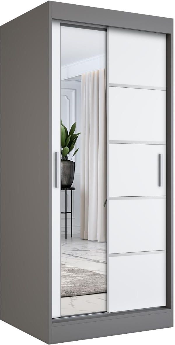 Szafa przesuwna MODUO COMFORT 3 90 antracyt/biała mat to funkcjonalna szafa do sypialni, salonu lub przedpokoju wykonana z płyty meblowej laminowanej z jednym frontem dekoracyjnym oraz jednym lustrem.