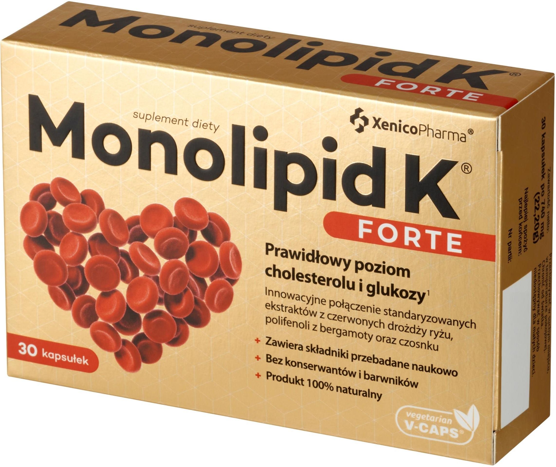 Monolipid K® Forte Monolipid K® forte to innowacyjny produkt zawierający w swoim składzie kombinacje ekstraktu z owoców bergamoty (Citrus bergamia Risso) standaryzowanego na 40% polifenoli BPF (ang. Bergamot-derived Polyphenolic Fraction) w najwyższej dawce 400 mg oraz aktywny ekstrakt z czerwonych drożdży ryżu standaryzowany na zawartość Monakoliny K, która pomaga w utrzymaniu prawidłowego cholesterolu, co wraz z jej skutecznością i bezpieczeństwem potwierdził Europejski Urząd ds. Bezpieczeństwa Żywności (EFSA). Poświadczył on także rolę Monakoliny K w prewencji chorób sercowo-naczyniowych. Produkt w 100% naturalny. Monolipid K® Forte nie zawiera cukru, soli, glutenu, kazeiny i laktozy. Wyprodukowany bez użycia sztucznych substancji konserwujących, zapachowych oraz bez zbędnych barwników. Preparat bezpieczny dla diabetyków. Skuteczność i bezpieczeństwo potwierdzone w badaniach klinicznych Rekomendacja Europejskiego Urzędu ds. Bezpieczeństwa Żywności 100% naturalny produkt Vcaps® to specjalistyczne, opatentowane kapsułki roślinne wyprodukowane z HPMC (celulozy roślinnej) i wody – bez konserwantów i żelatyny. Polecane dla vegan oraz wegetarian Bezpieczeństwo stosowania : Wyniki przeprowadzonych od tego czasu analiz wskazują na bardzo duże bezpieczeństwo stosowania czerwonego ryżu, nawet u pacjentów z nietolerancją statyn, a częstość działań niepożądanych z analizy konsumenckiej szacuje się na mniej niż 0,04 proc. Co ciekawe, od 2011 r. sprzedano w Europie ok. 40 mln opakowań preparatów monakoliny, a zgłoszono tylko 55 zdarzeń niepożądanych po jej użyciu. Badania co do dawkowania 3 mg: Odnośnie ilości 3 mg monakoliny K w suplemencie diety dostępne badania wykazują nadal dobre działanie monakoliny K mimo zmniejszonej dawki.  Uczestnicy grupy suplementacyjnej spożywali 3 mg monakoliny K i 200 μg kwasu foliowego dziennie. W grupie suplementacyjnej po 12 tygodniach określono znaczącą (P < .001) redukcję LDL-C (-14,8%), cholesterolu całkowitego (-11,2%) i homocysteiny (-12,5%). Łącznie 51% uczestników leczonych RYR osiągnęło graniczny poziom LDL-C <4,14 mmol/L, a 26% osiągnęło progowy poziom homocysteiny <10 μmol/L. W grupie placebo nie wykazano istotnych zmian. Pozostałe parametry pozostały bez zmian i nie zaobserwowano nietolerancji ani poważnych zdarzeń niepożądanych. Podsumowując, wykazane zostało, że niska dawka dzienna 3 mg monakoliny K zmniejsza stężenie LDL-C jako czynnika ryzyka chorób sercowo-naczyniowych. Więcej na www.monolipid.pl  https://www.sciencedirect.com/science/article/pii/S0271531716302317