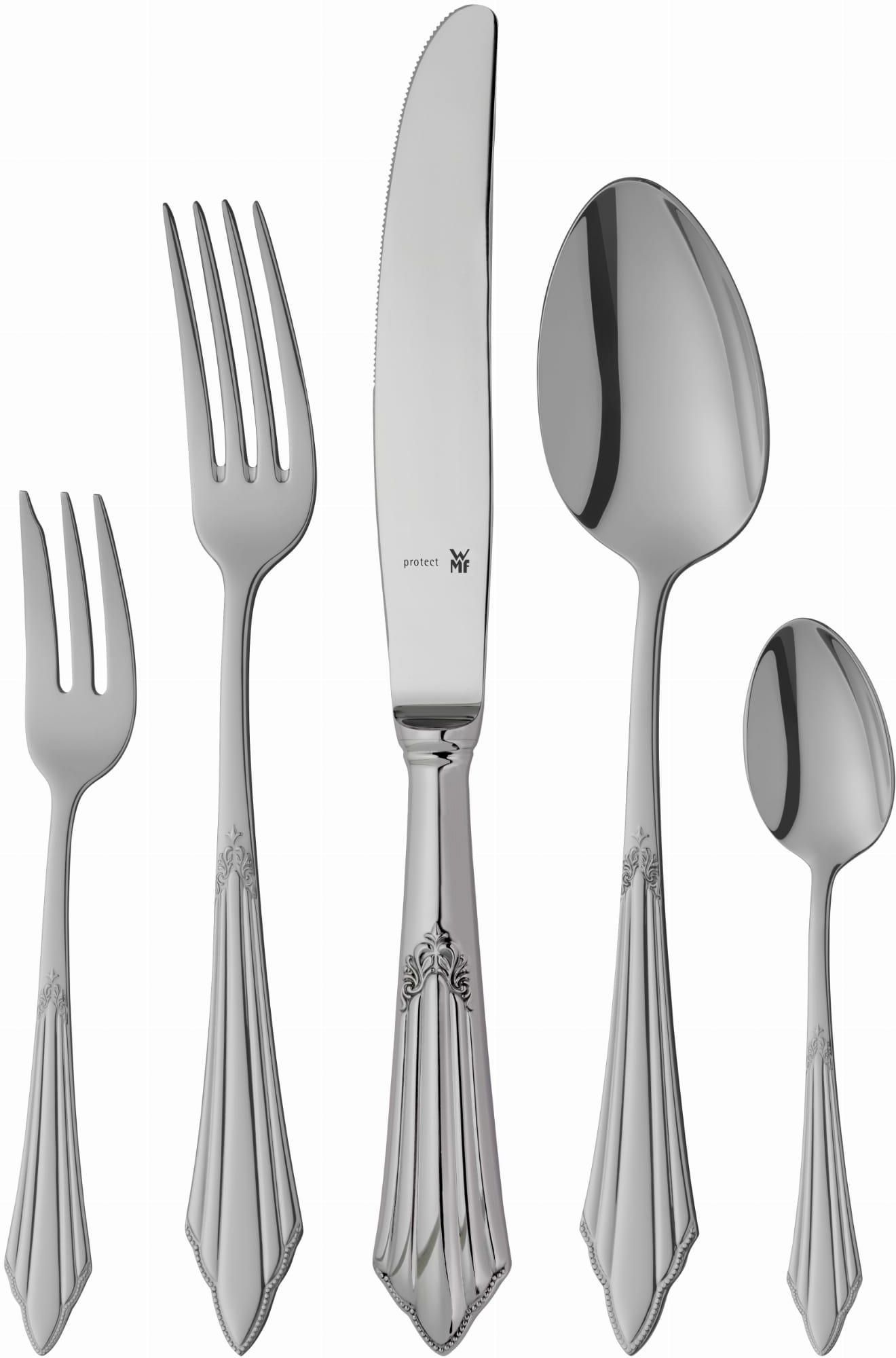 Marka WMF Wnosimy przyjemność do  Twojego życia WMF to coś więcej niż marka. To wieloletnia tradycja, która za nami stoi, wsparta doświadczeniem i niezwykłą dbałością o każdy detal. Dzięki innowacyjnemu podejściu WMF wyznacza standardy na rynku międzynarodowym oraz staje się źródłem inspiracji. Oferujemy Ci funkcjonalne, ale też piękne produkty o najwyższej jakości. Dzięki nim wszystko, co przygotujesz stanie się prawdziwą kulinarną przygodą. Od idealnie precyzyjnego cięcia niezawodnym nożem, poprzez smażenie na nowatorskiej patelni, aż po dekorowanie stołu, które zamienia się w sztukę dzięki niezwykle pięknym zastawom. WMF to Twój partner w kuchni, który każdą chwilę czyni wyjątkową. Niezmiennie od 1853 roku. Zestaw sztućców Fächer 66 elementów (12 osób) Zestaw sztućców z serii Facher to wyjątkowy komplet dla 12 osób charakteryzujący się wyjątkowym designem i wysoką jakością wykonania. Sztućce są idealne do codziennego spożywania posiłków, jak również dzięki dekoracyjnemu wykończeniu idealnie nadaję się na specjalne okazję. Sztućce zostały wykonane z wysokiej jakości stali nierdzewnej Cromargan®18/10 odpornej na korozje i kwasy spożywcze.  Sztućce będą prezentować się doskonale w towarzystwie nowoczesnej i klasycznej zastawie stołowej.  Wszystkie elementy można myć w zmywarce. 12 x Widelec stołowy  12 x Nóż stołowy  12 x Łyżka stołowa  12 x Łyżeczka  12 x Widelczyk  1 x Łopatka do ciasta  1 x Chochla średnia  1 x Widelczyk do wędlin  1 x Łyżka do serwowania  1 x Komplet łyżek do sałaty (2 elementy)